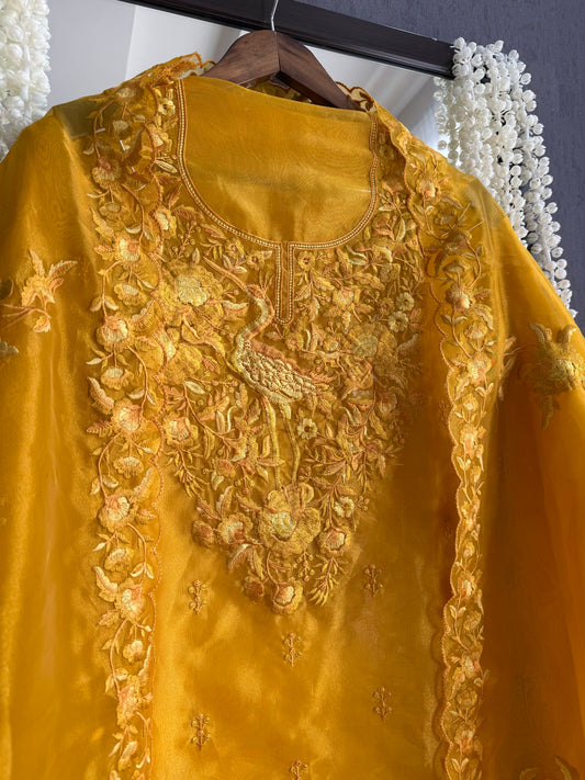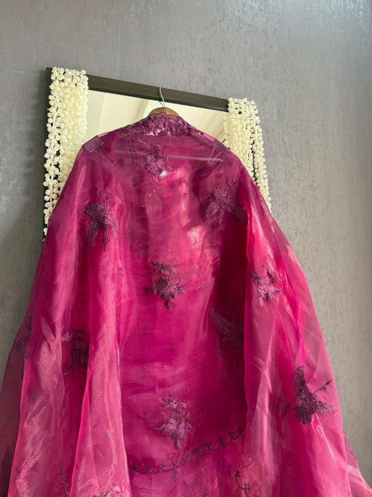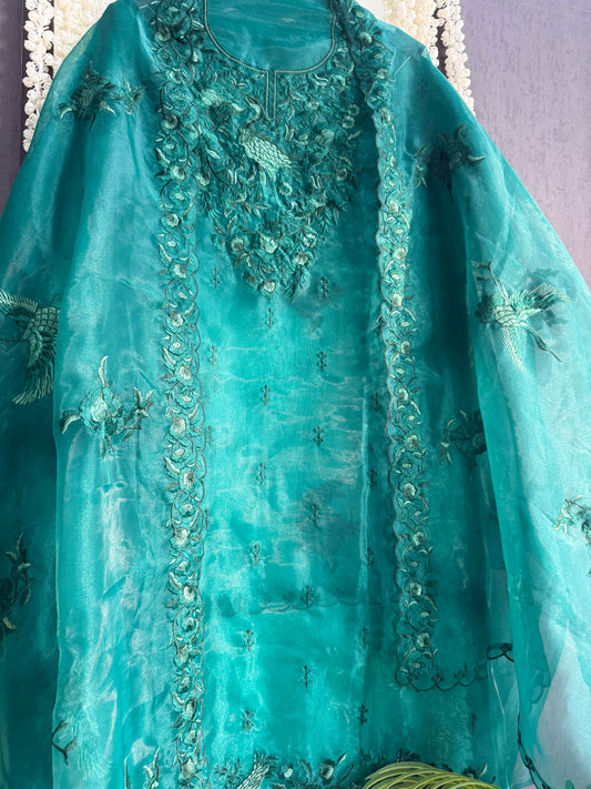 Organza silk parsi work flamingos suit