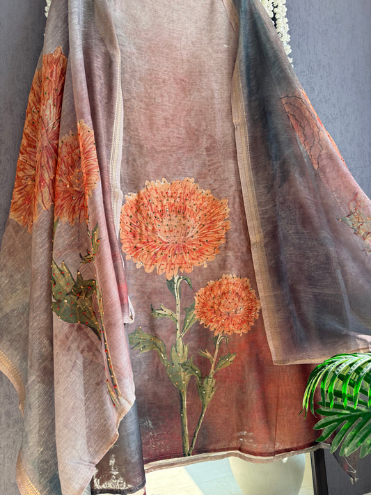 Pure linen marigold kantha work suit