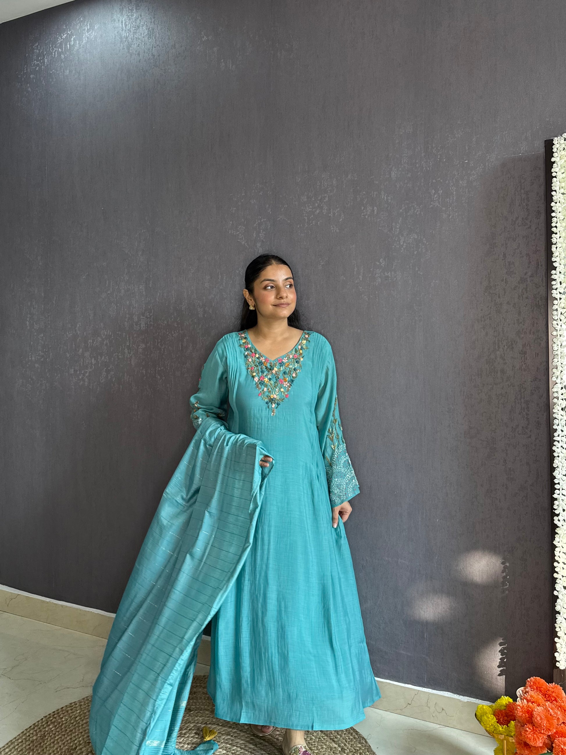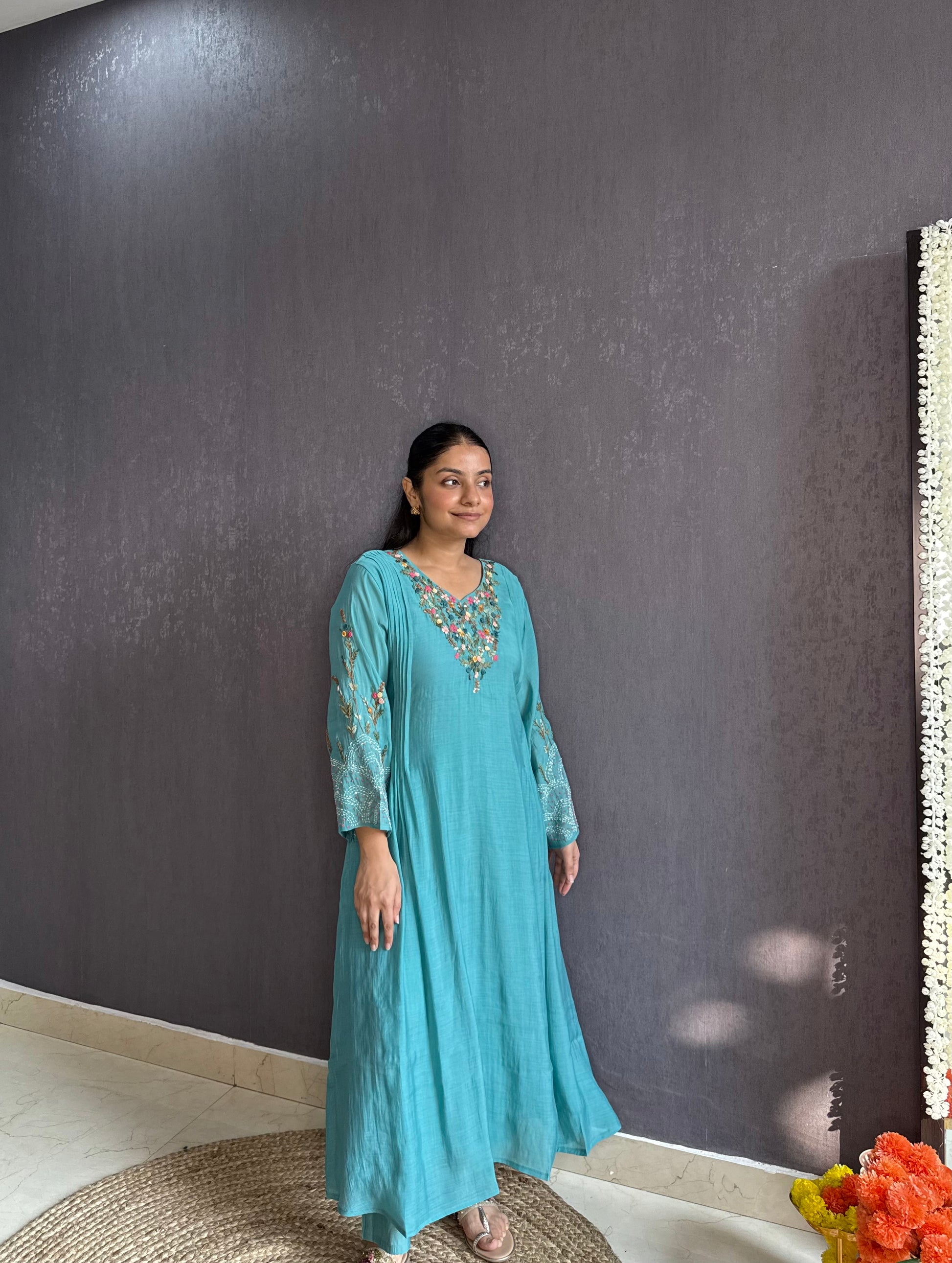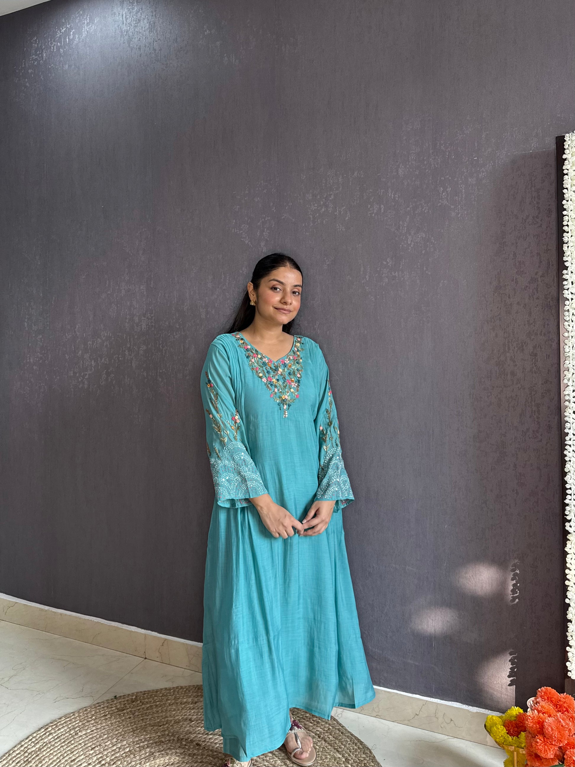 • Floral work handwork frenchknot kantha details on kurta.