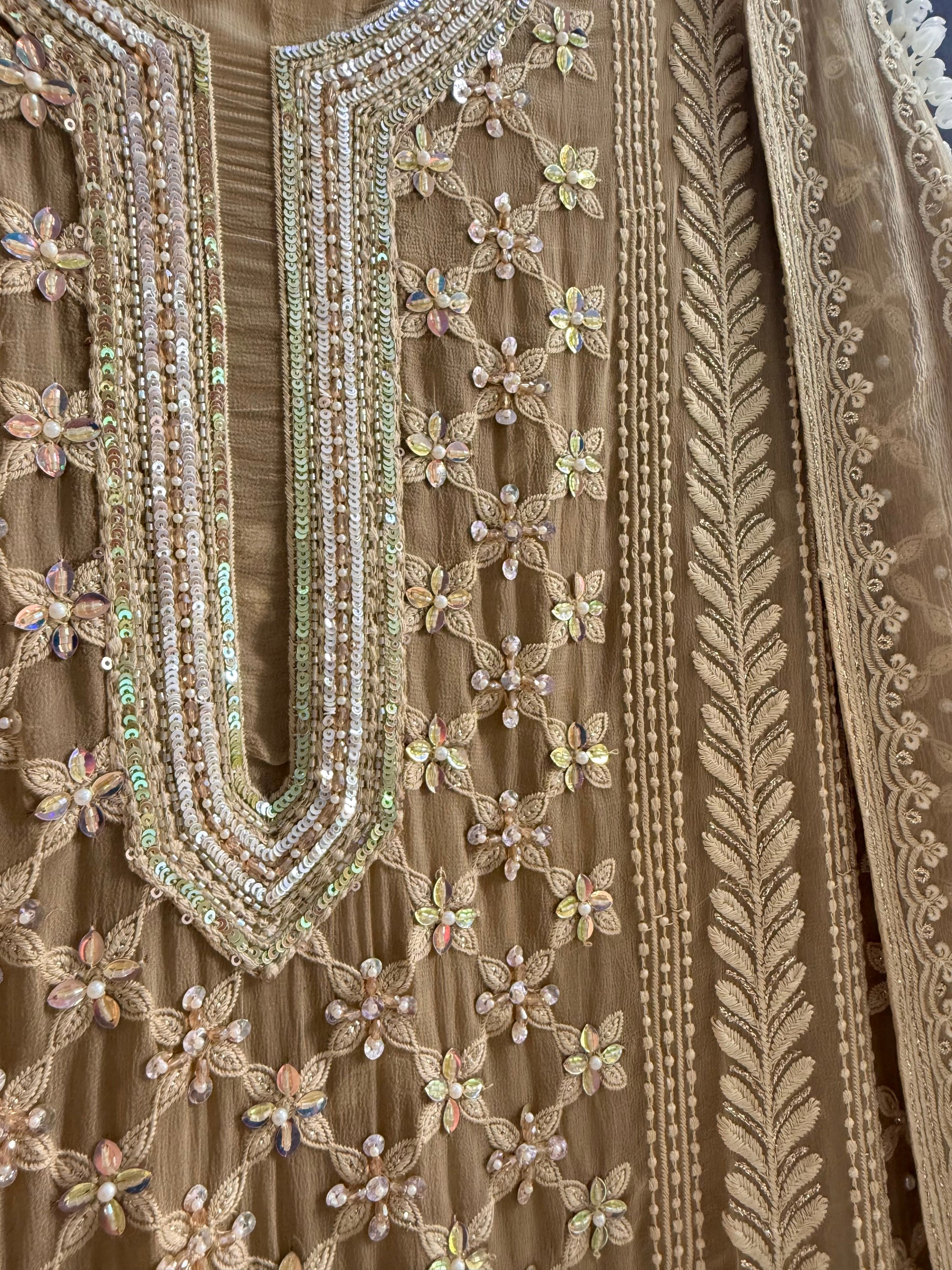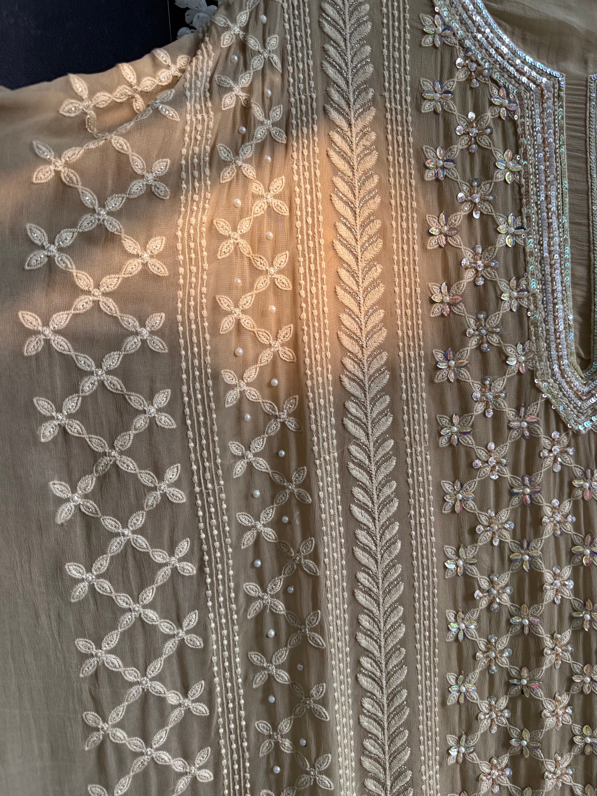 Dupatta- Pure georgette dupatta with lucknowi chikankari work embellished by zari.