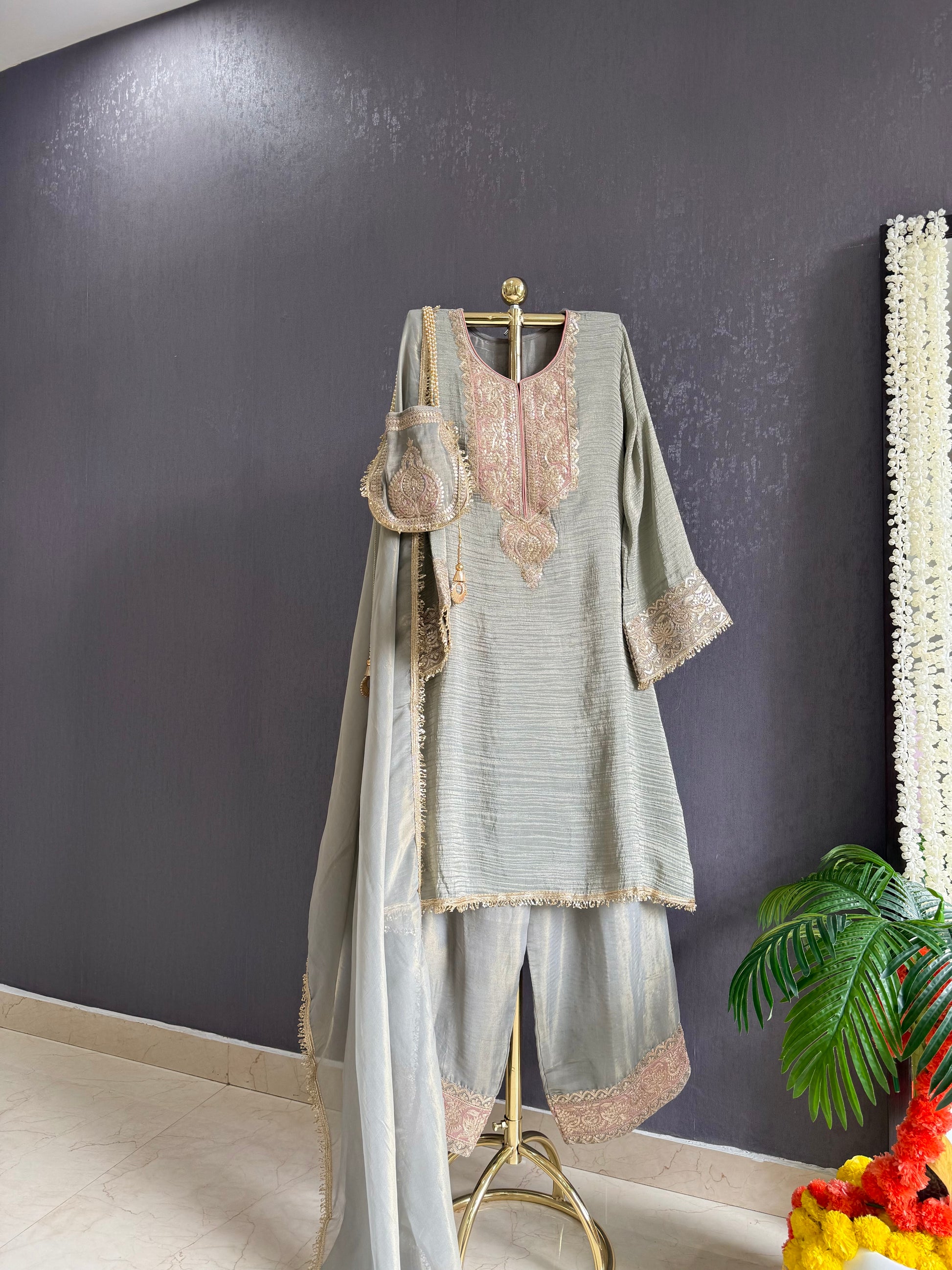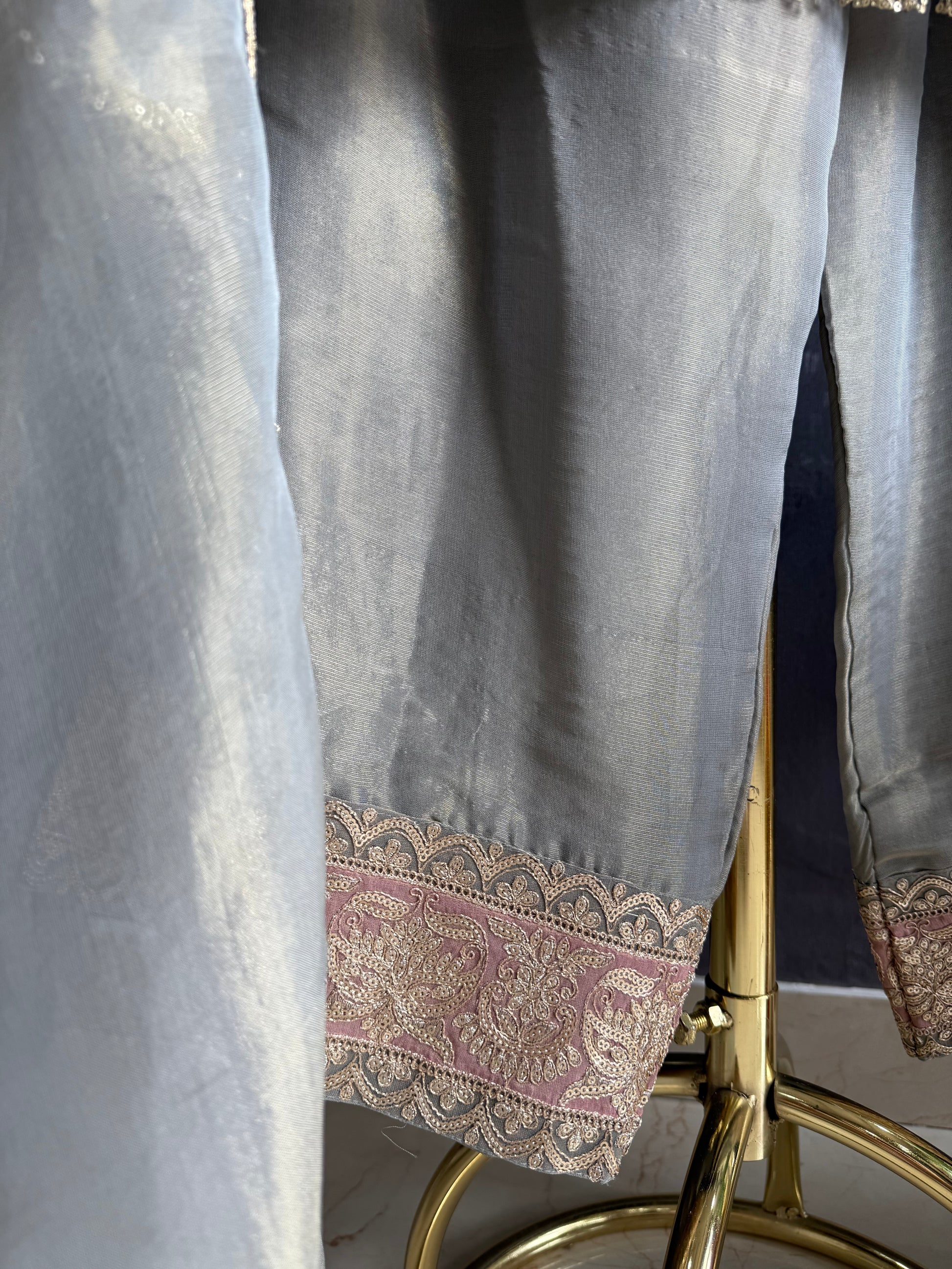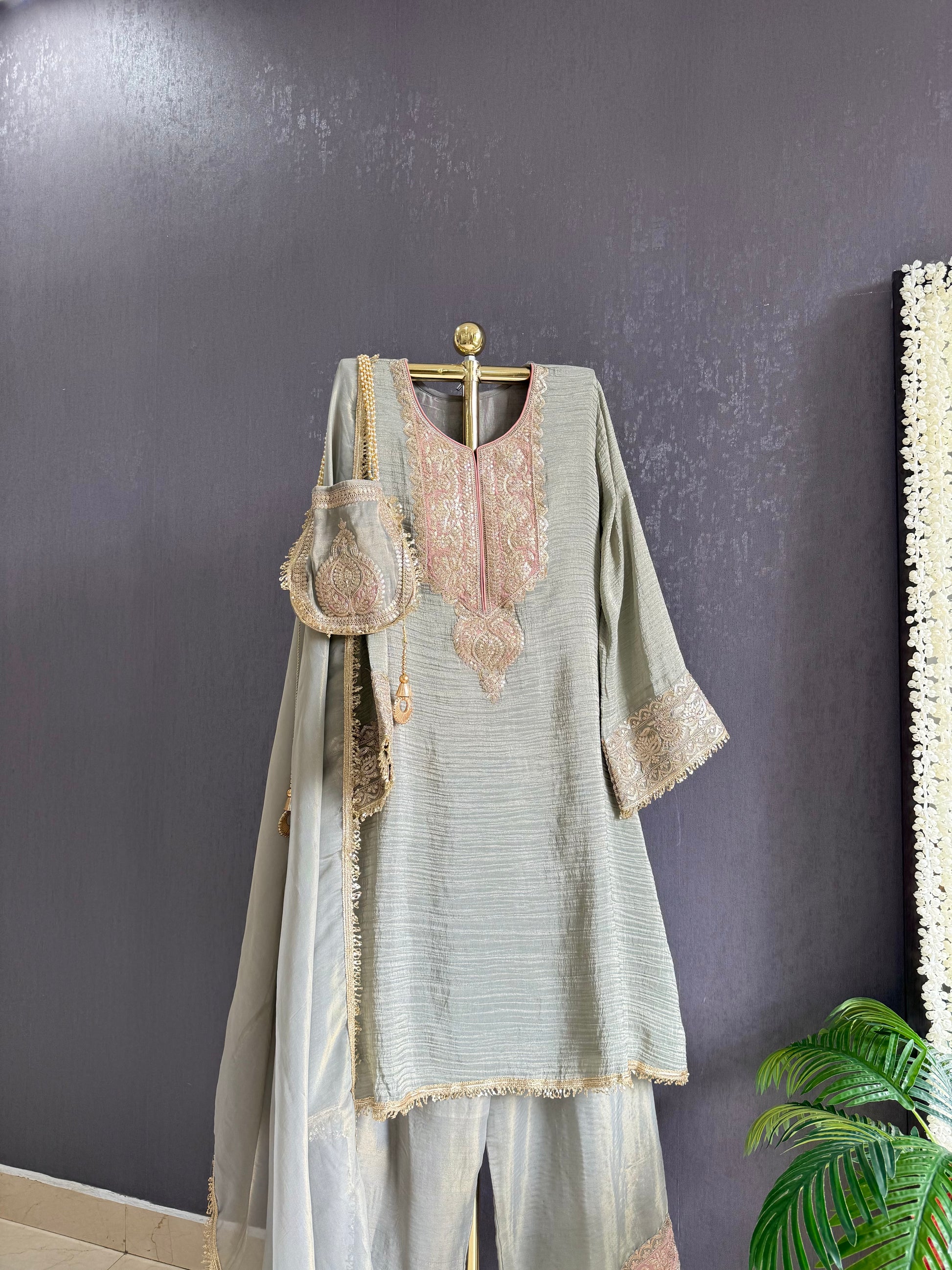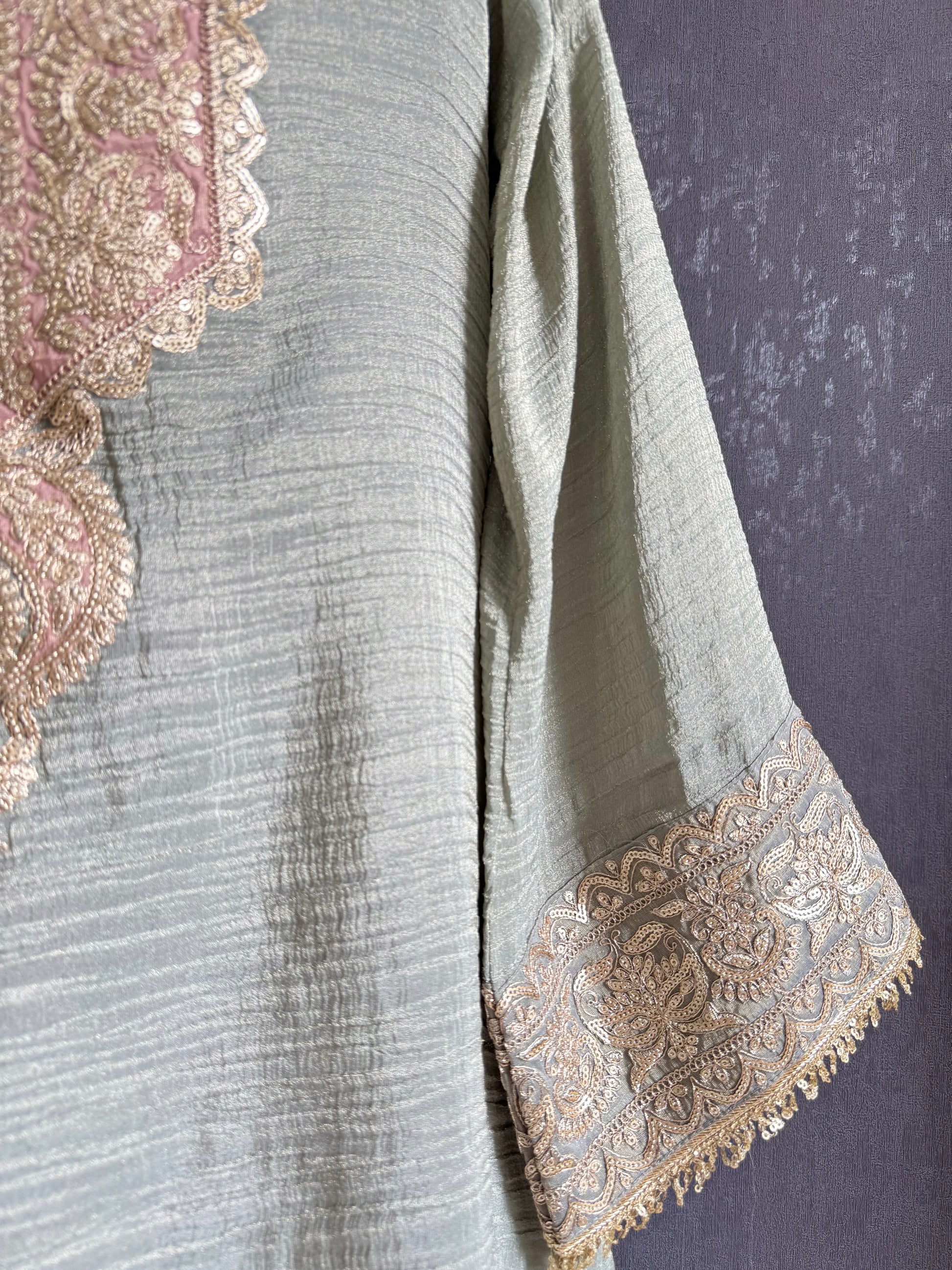 • Heavy aari work detailing on contrast base on A line crush tissue silk kurtas  With heavy arms and yoke front and back .