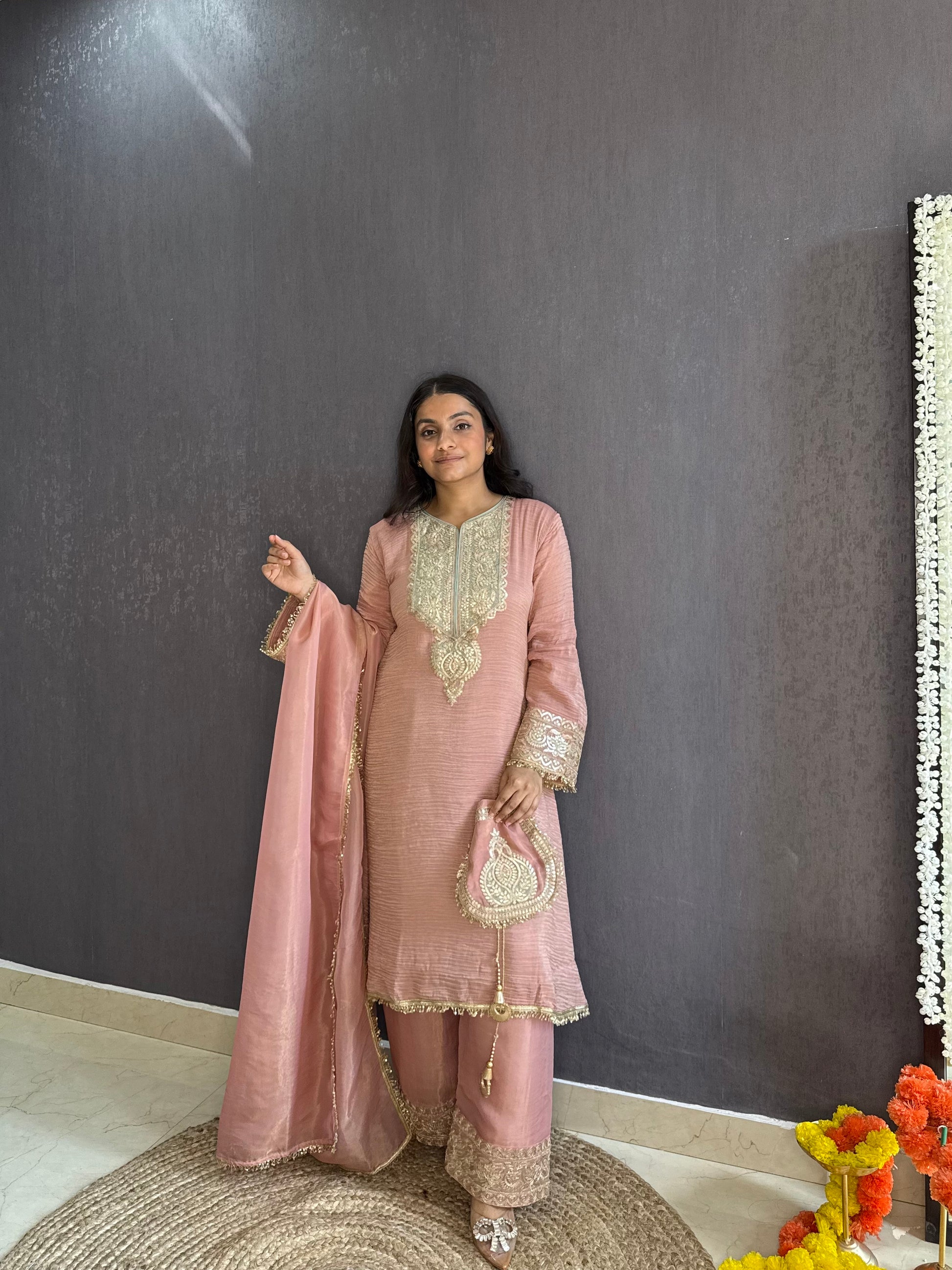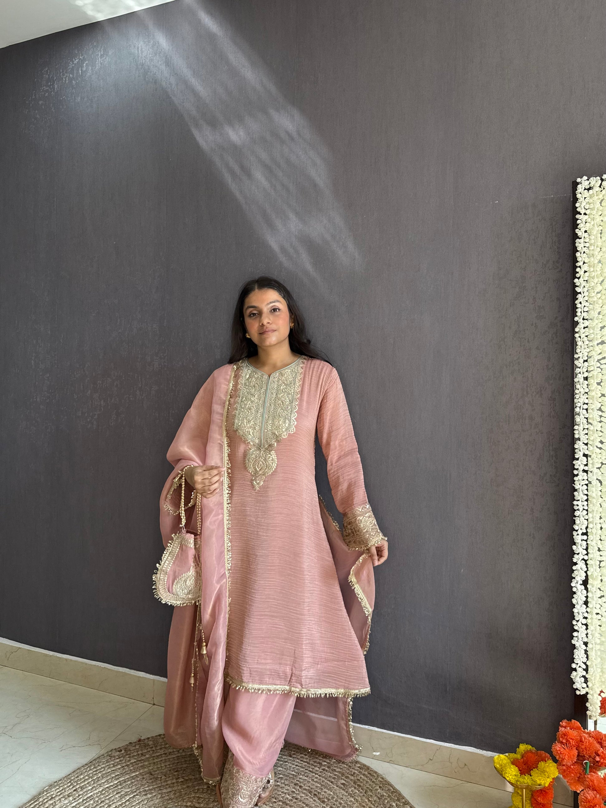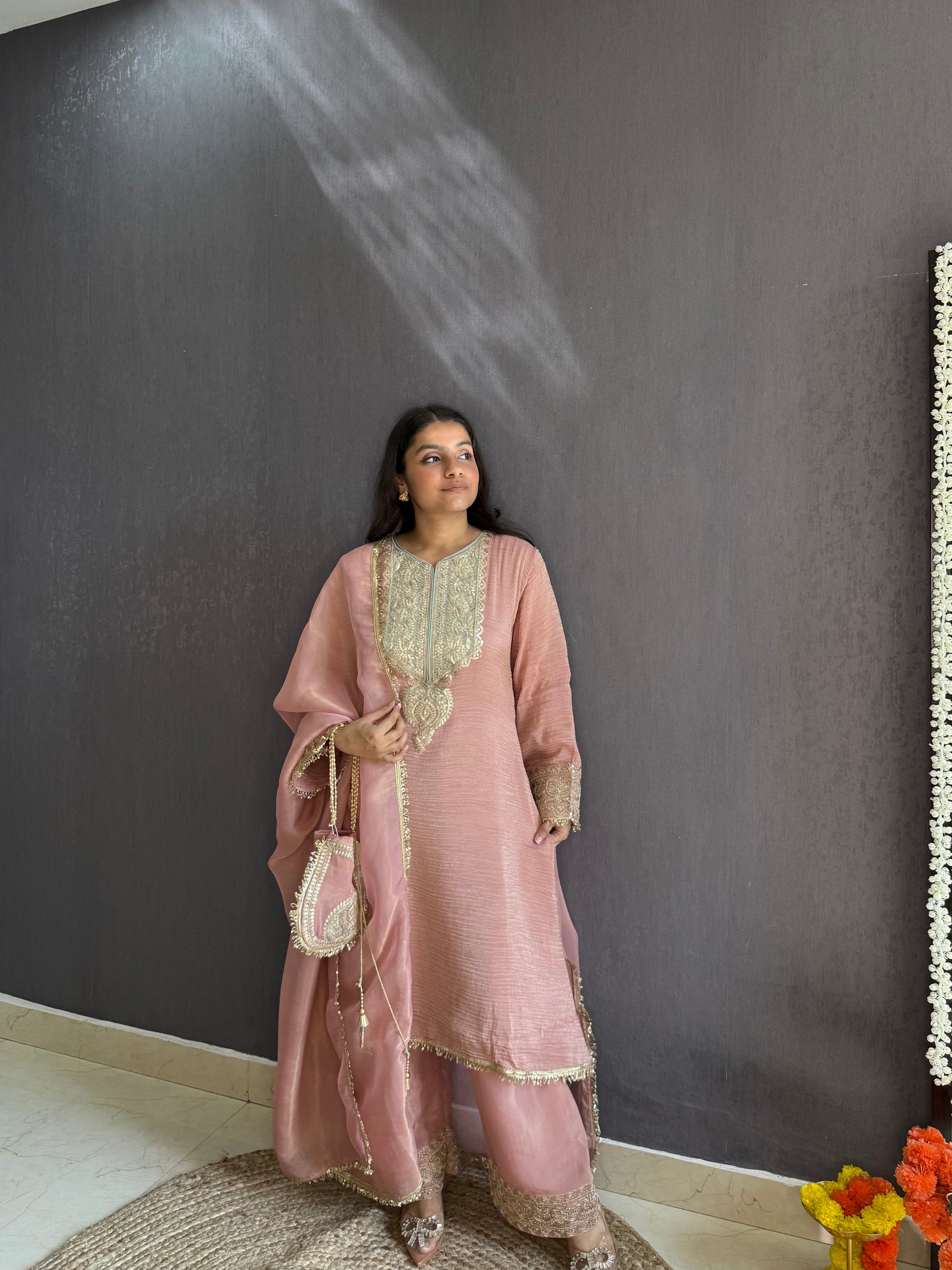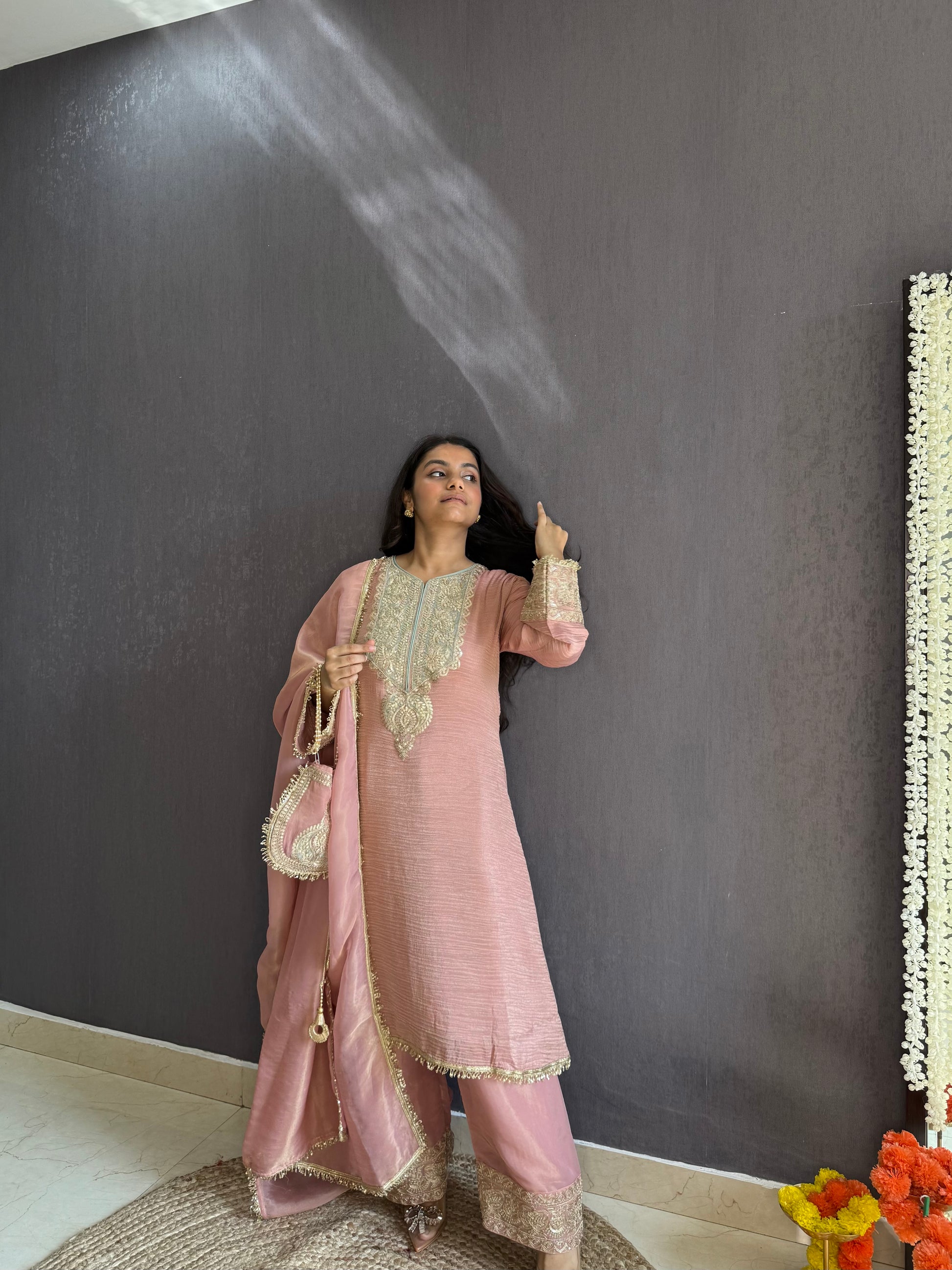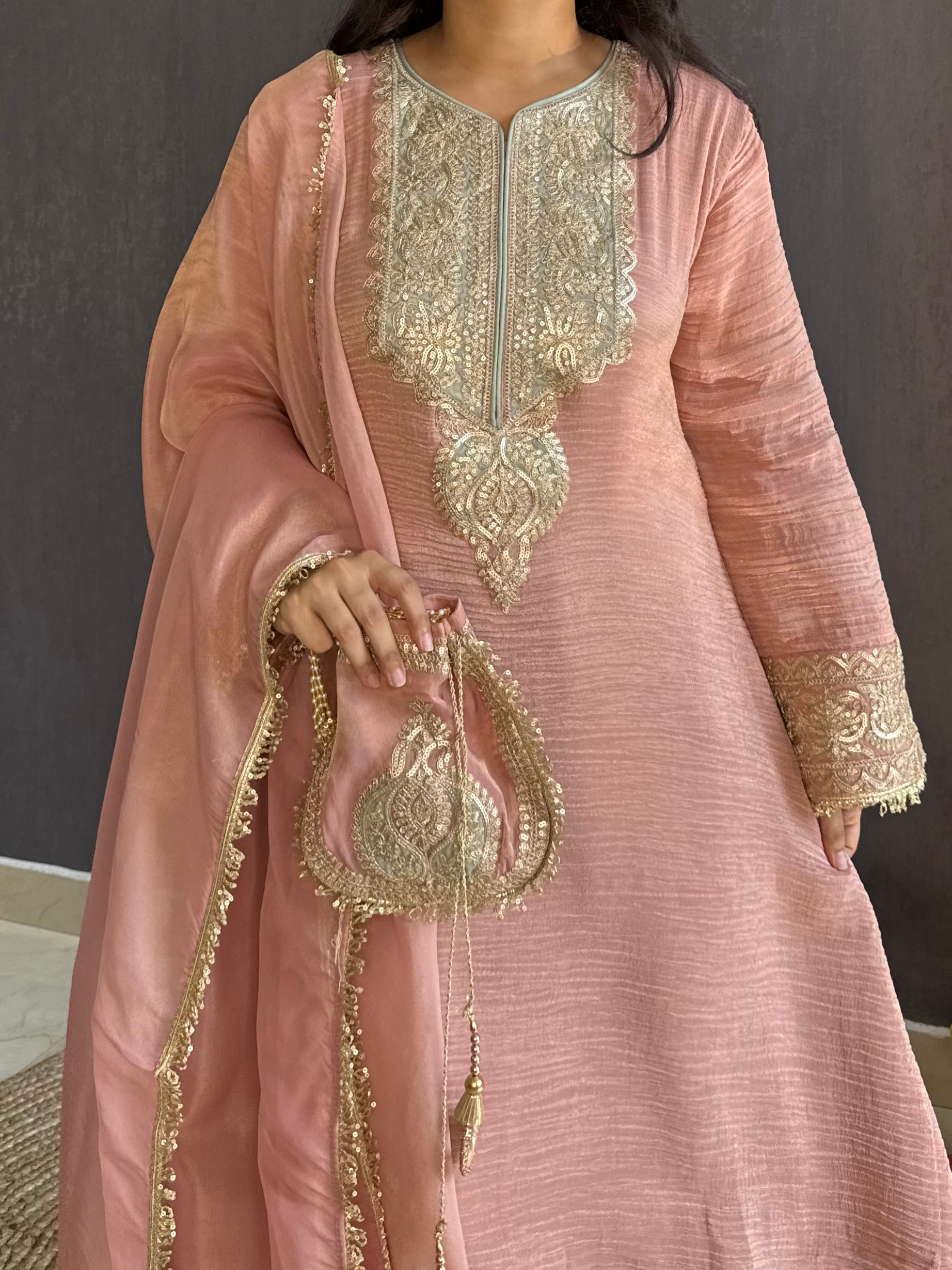 • Heavy aari work detailing on contrast base on A line crush tissue silk kurtas  With heavy arms and yoke front and back .