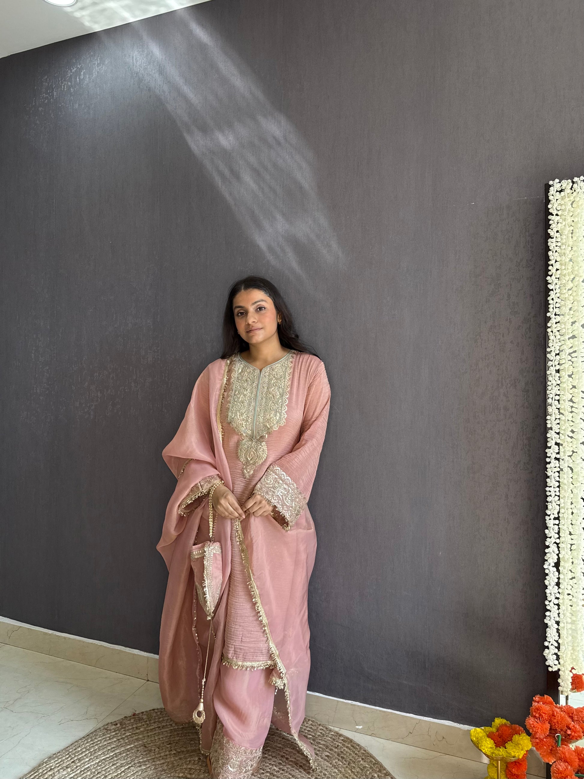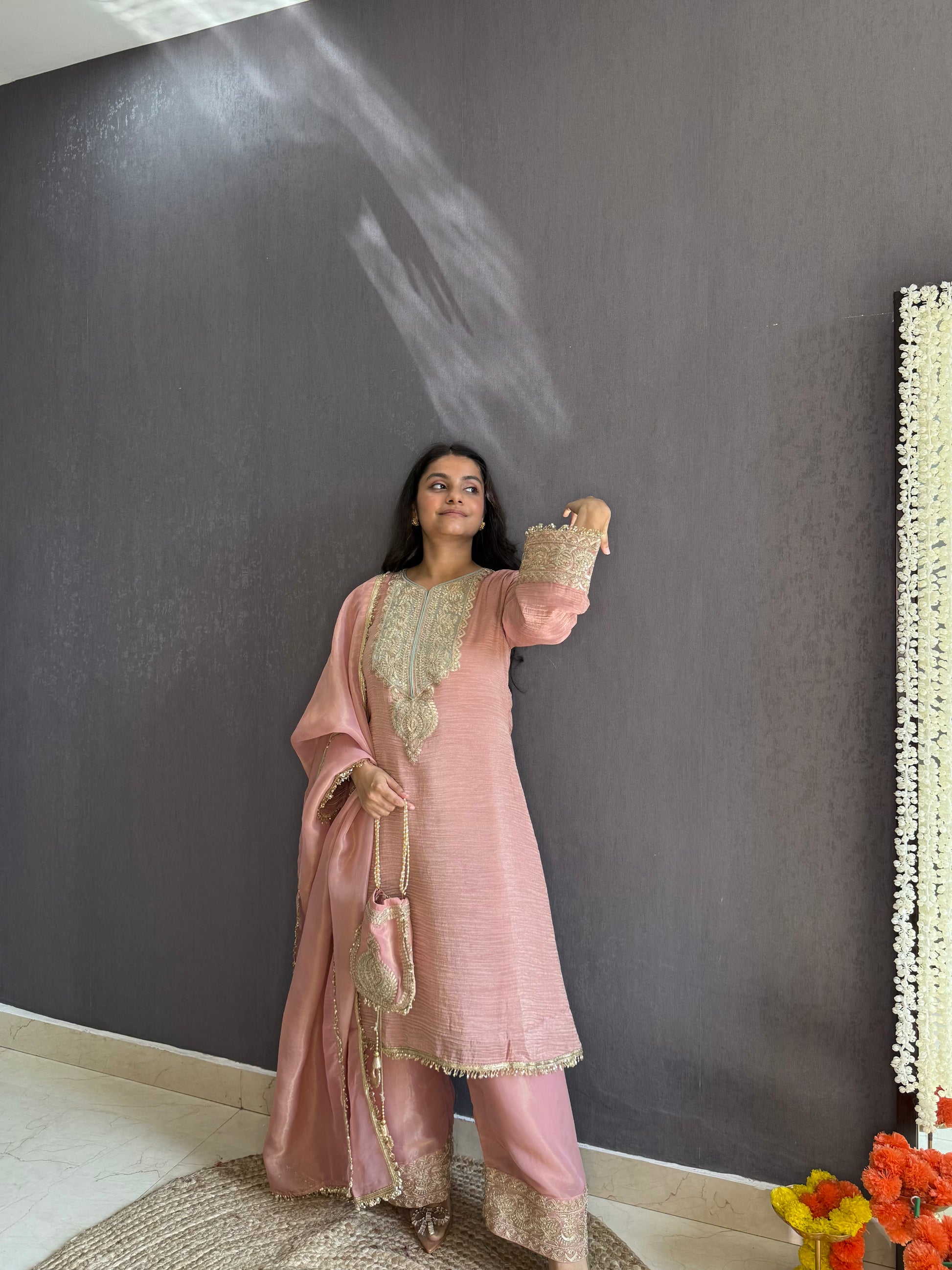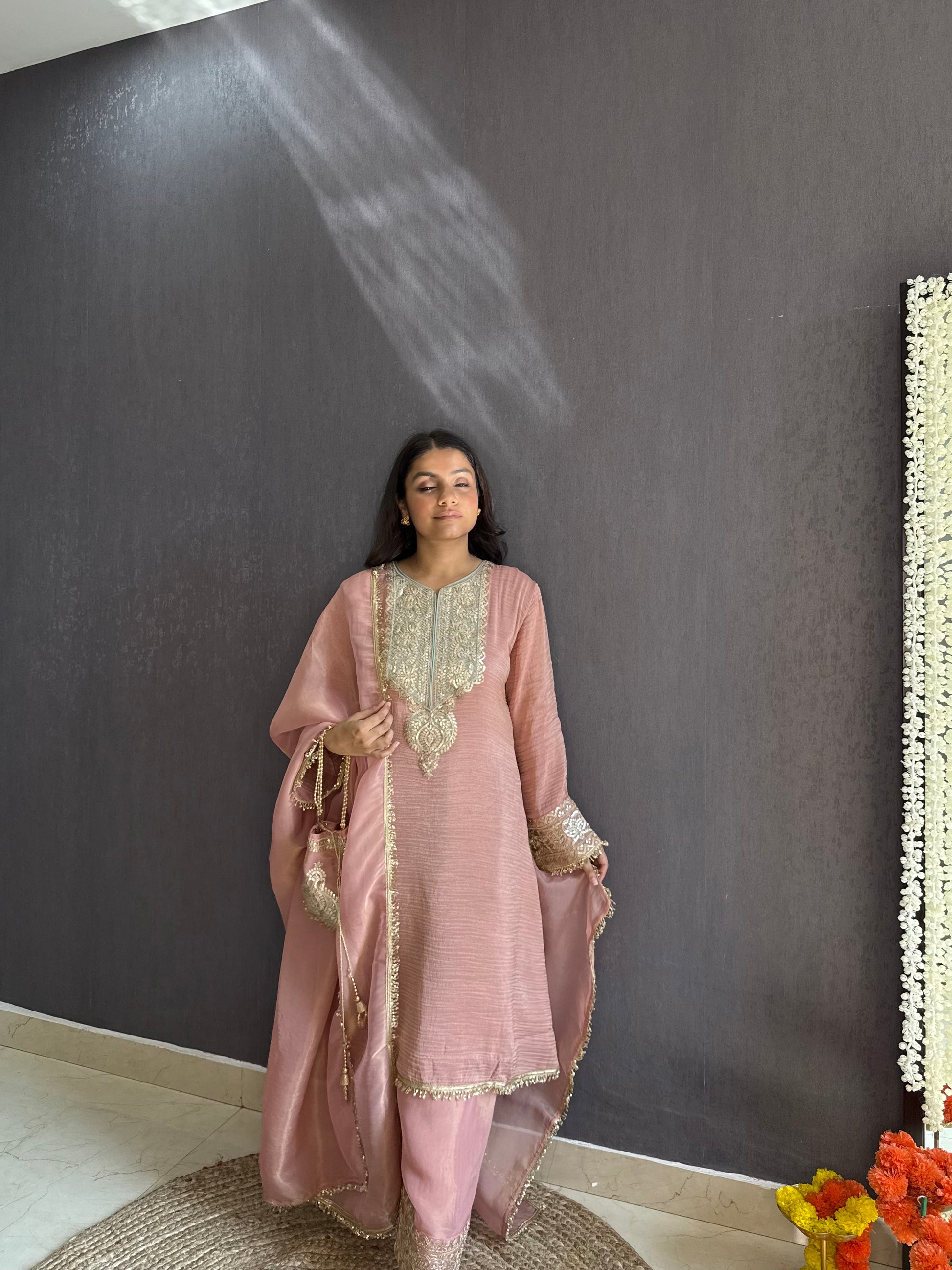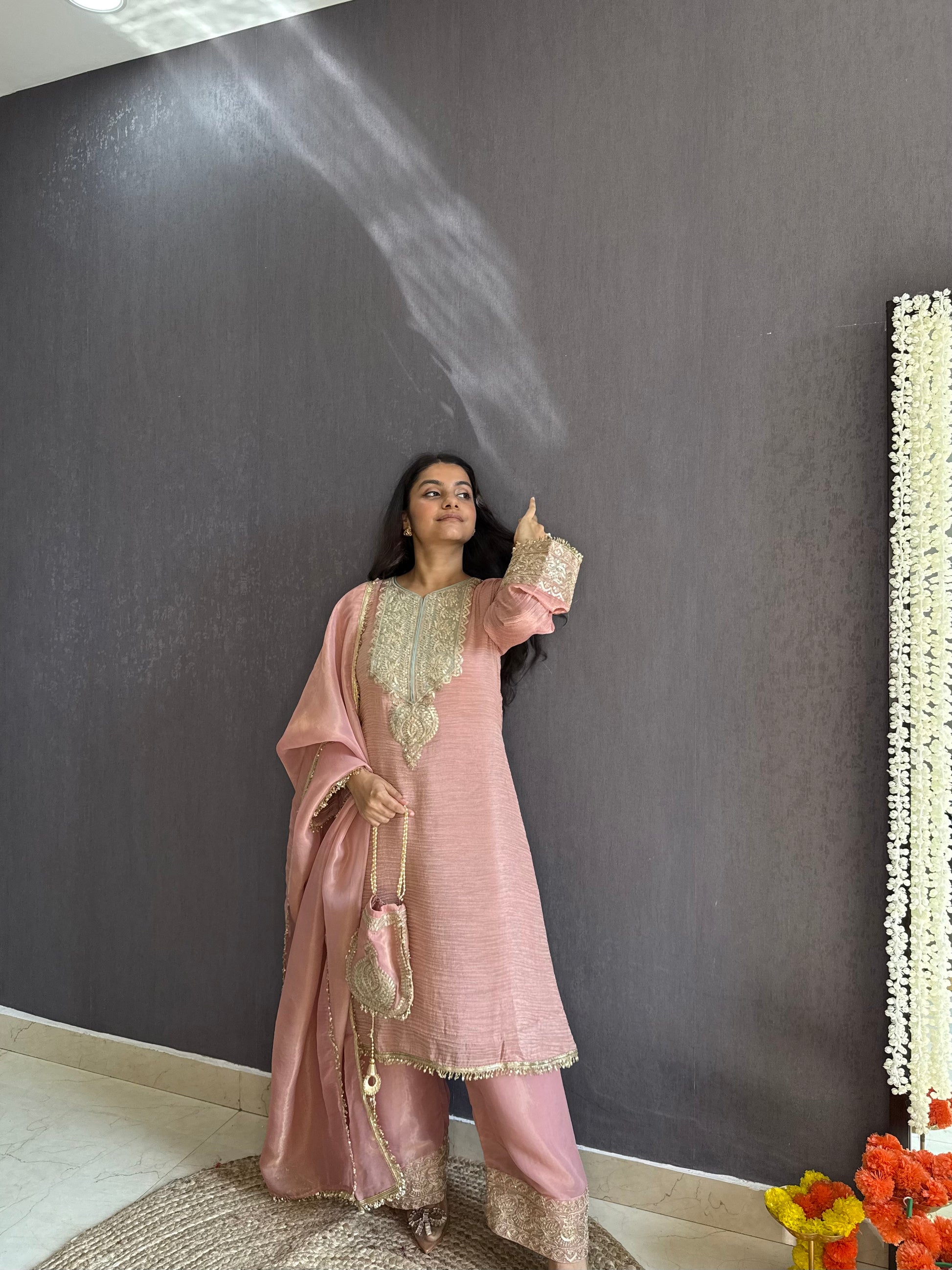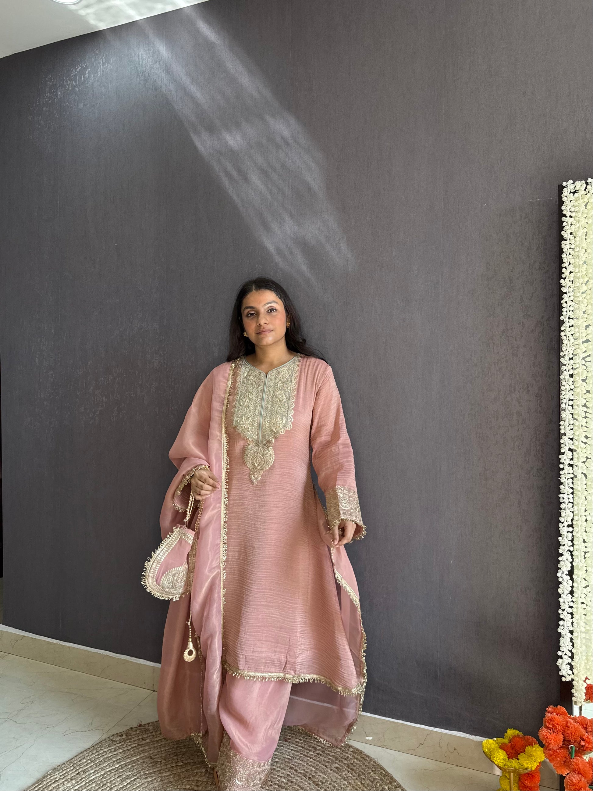 • Heavy aari work detailing on contrast base on A line crush tissue silk kurtas  With heavy arms and yoke front and back .
