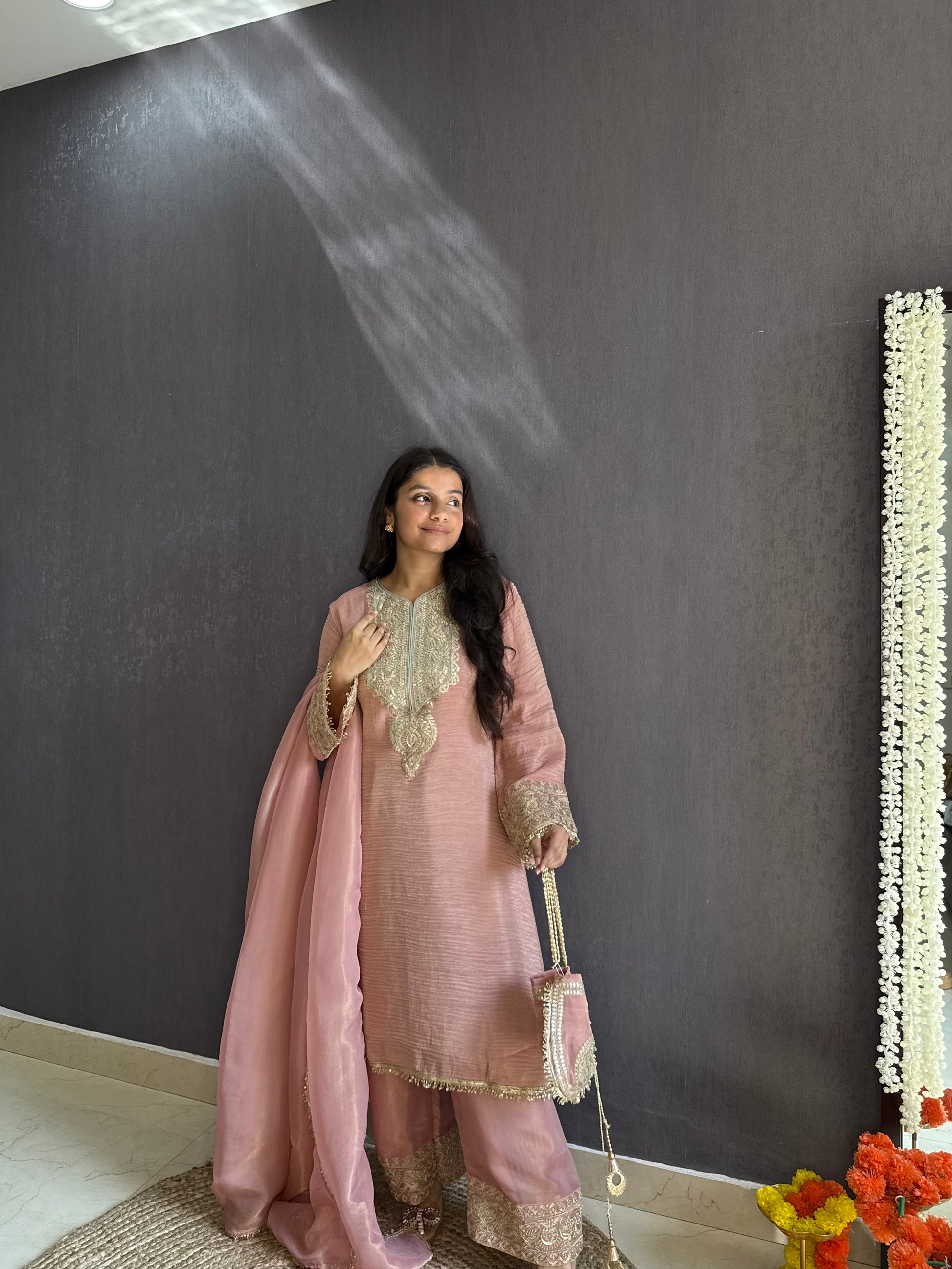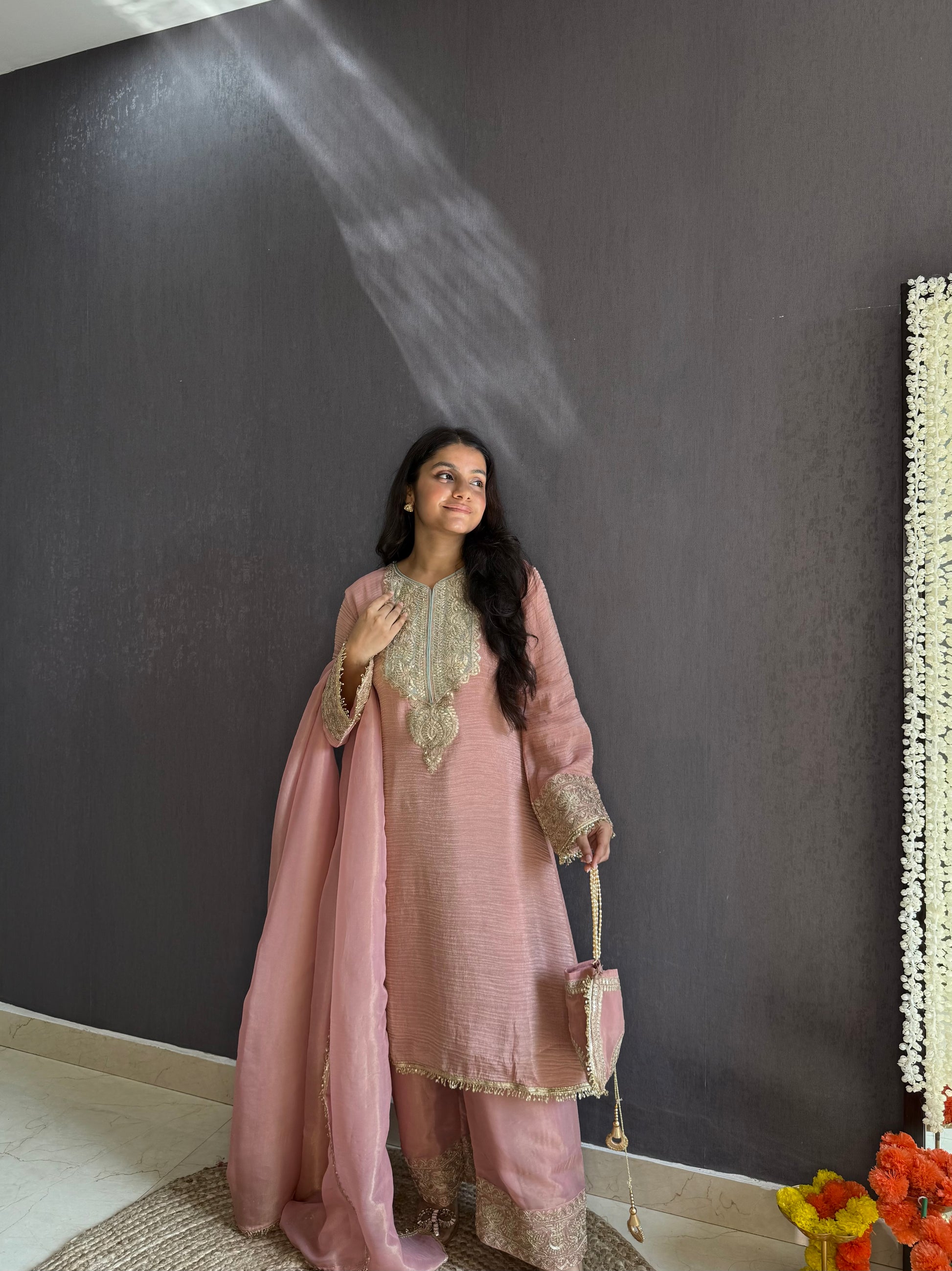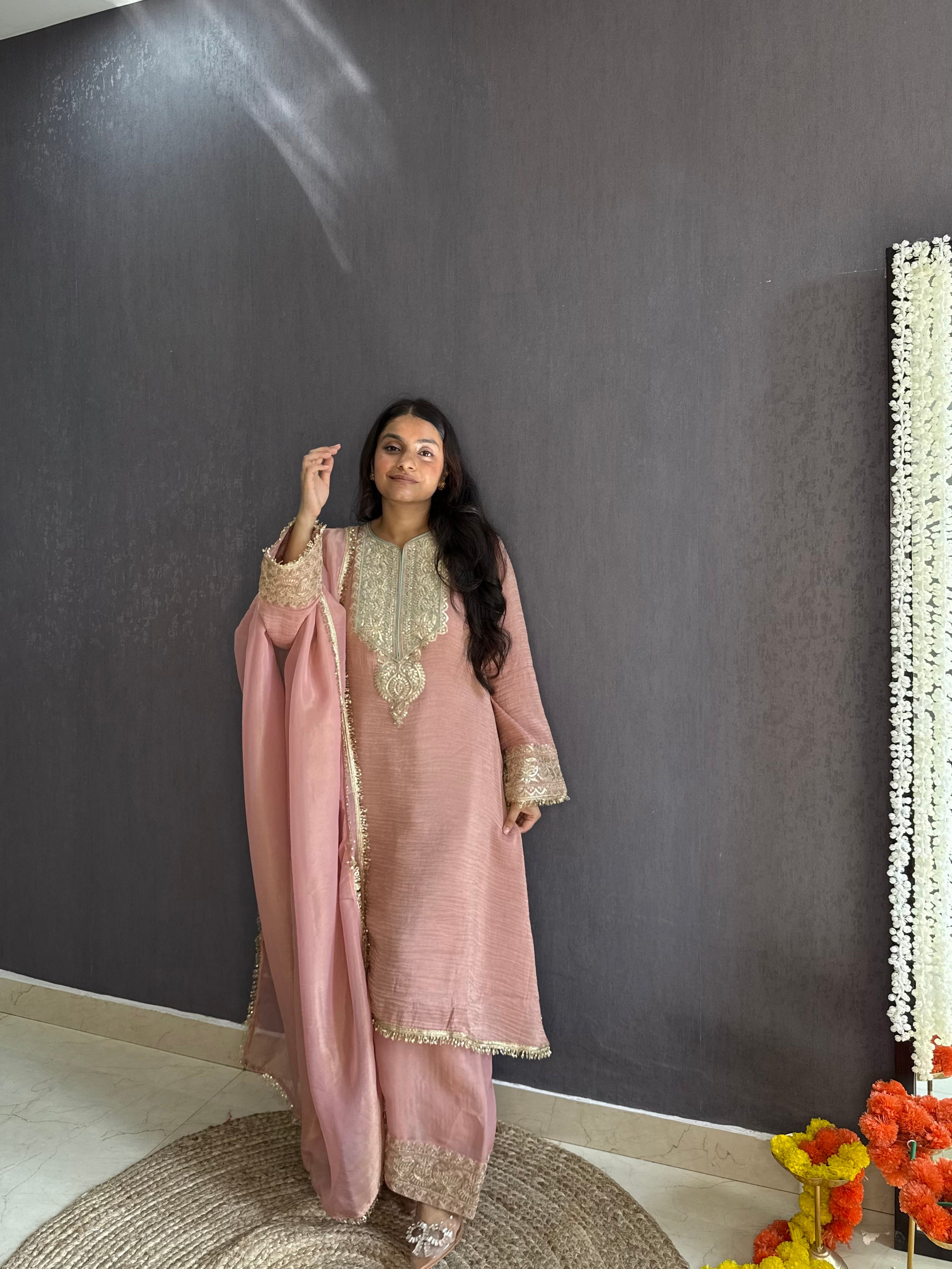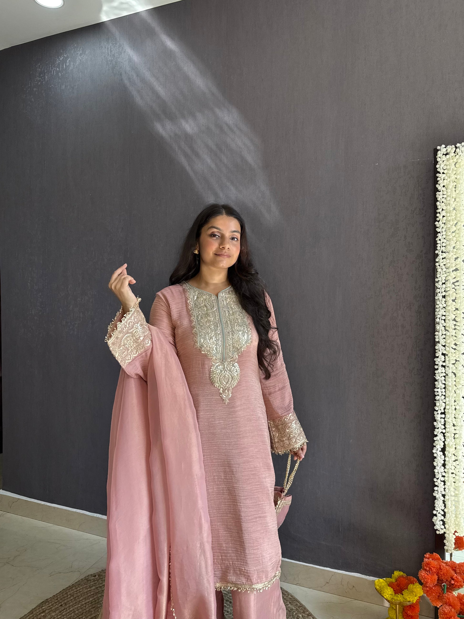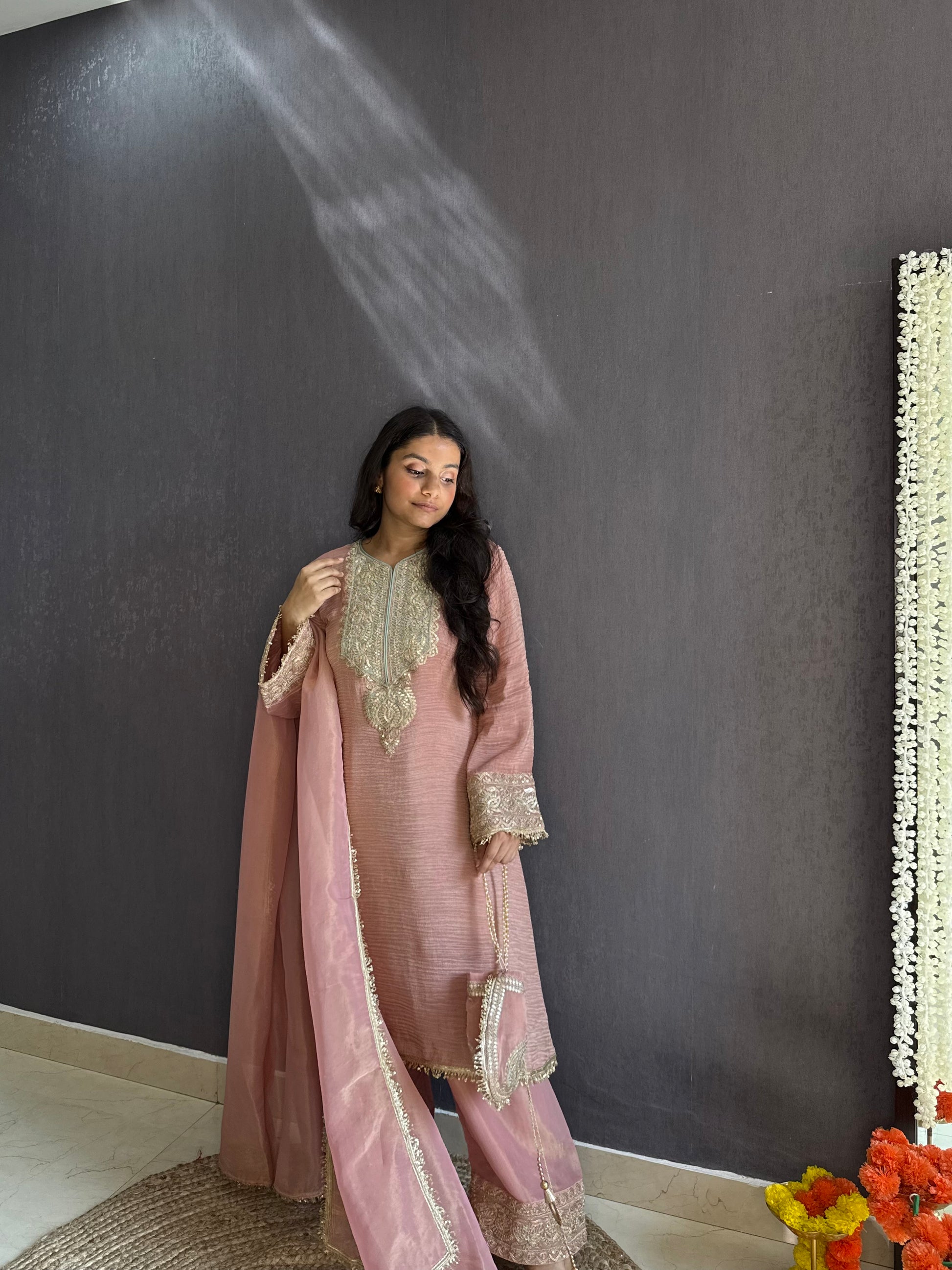 • Heavy aari work detailing on contrast base on A line crush tissue silk kurtas  With heavy arms and yoke front and back .