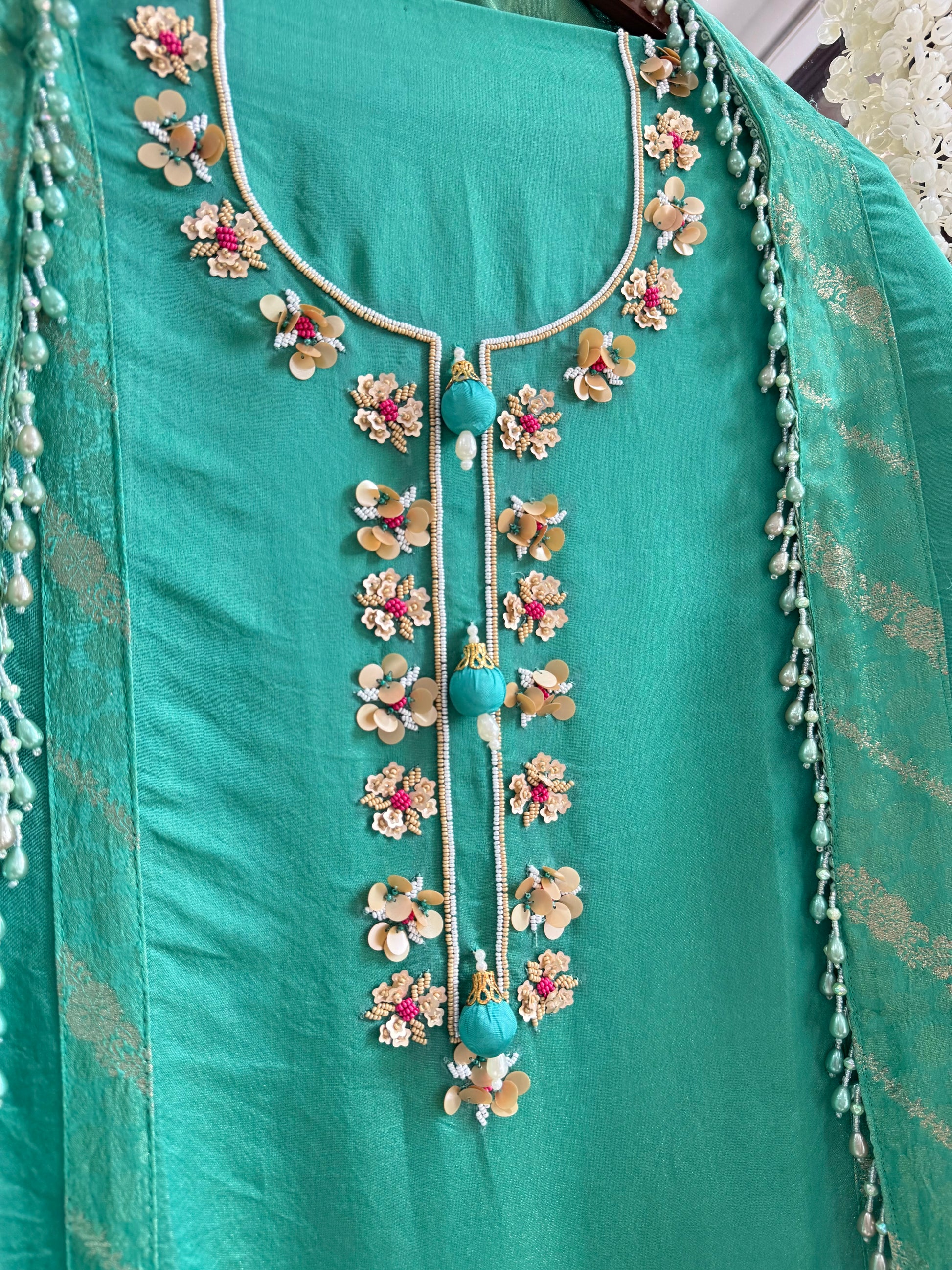 Three -piece pure soft tissue silk benarsi handwork suit.