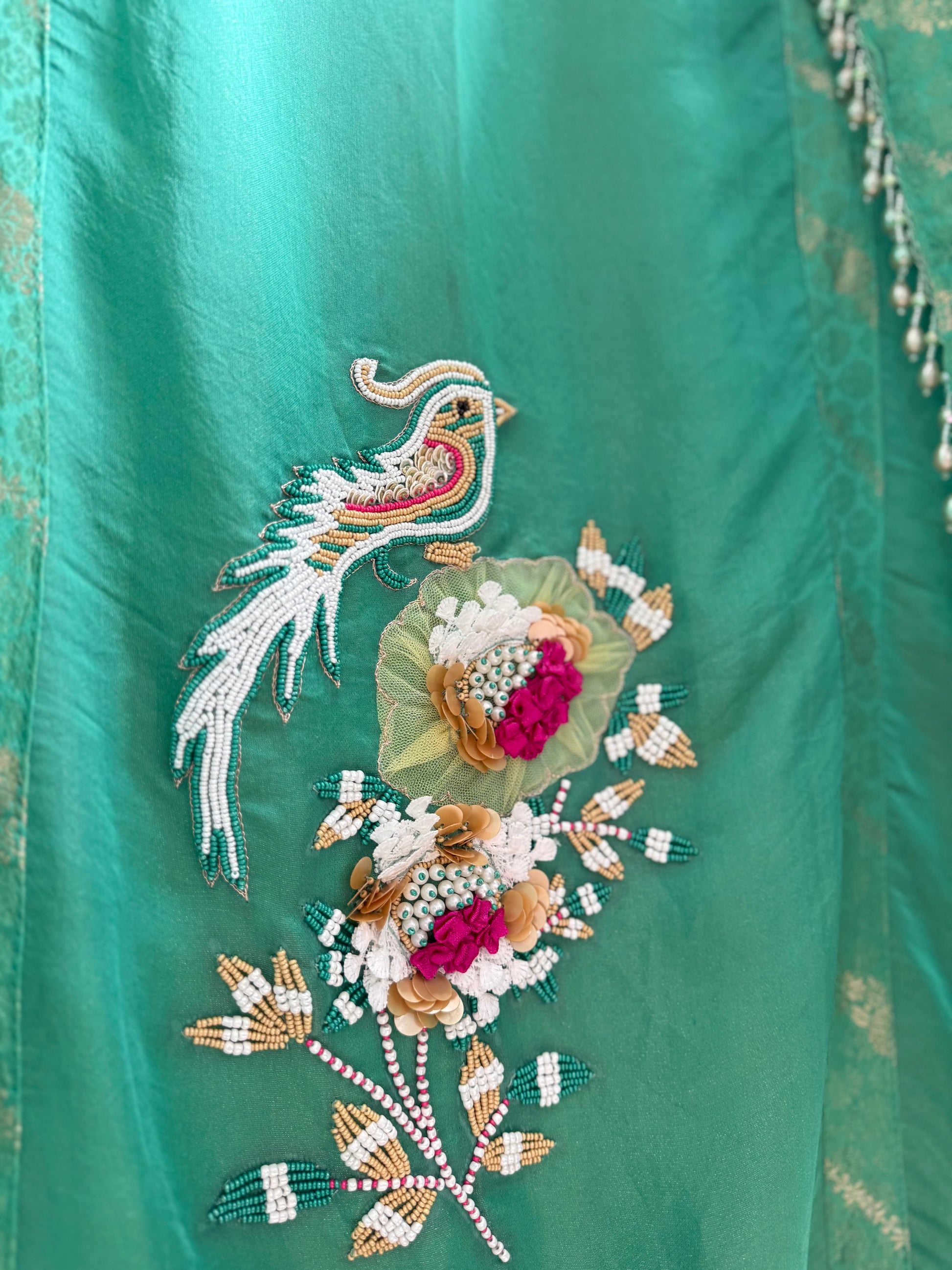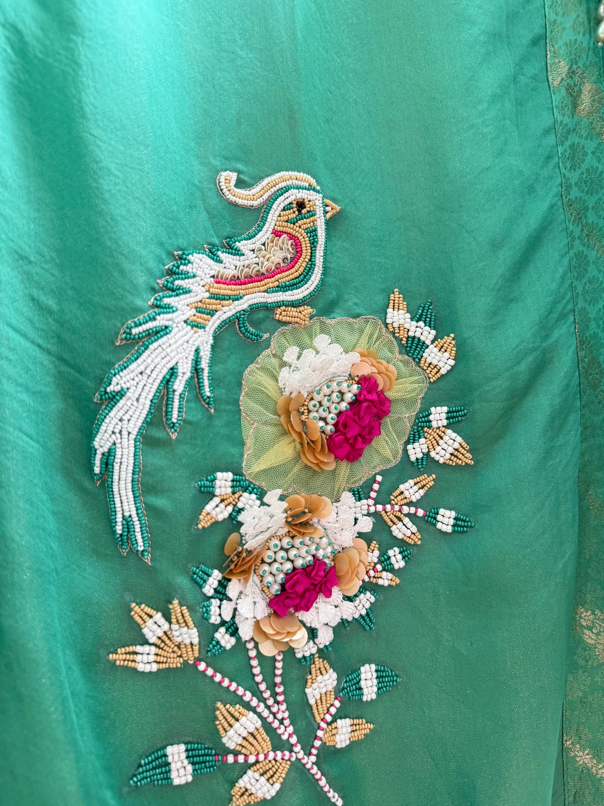 Shirt-Elegant, Easy-To-Style, & Statement-Worthy, Soft  tissue silk Kurtas  embellished by handwork details of sequins,bead and heavily embellished by pearls and 3d flowers - in beautiful pattern of birds and elephants .