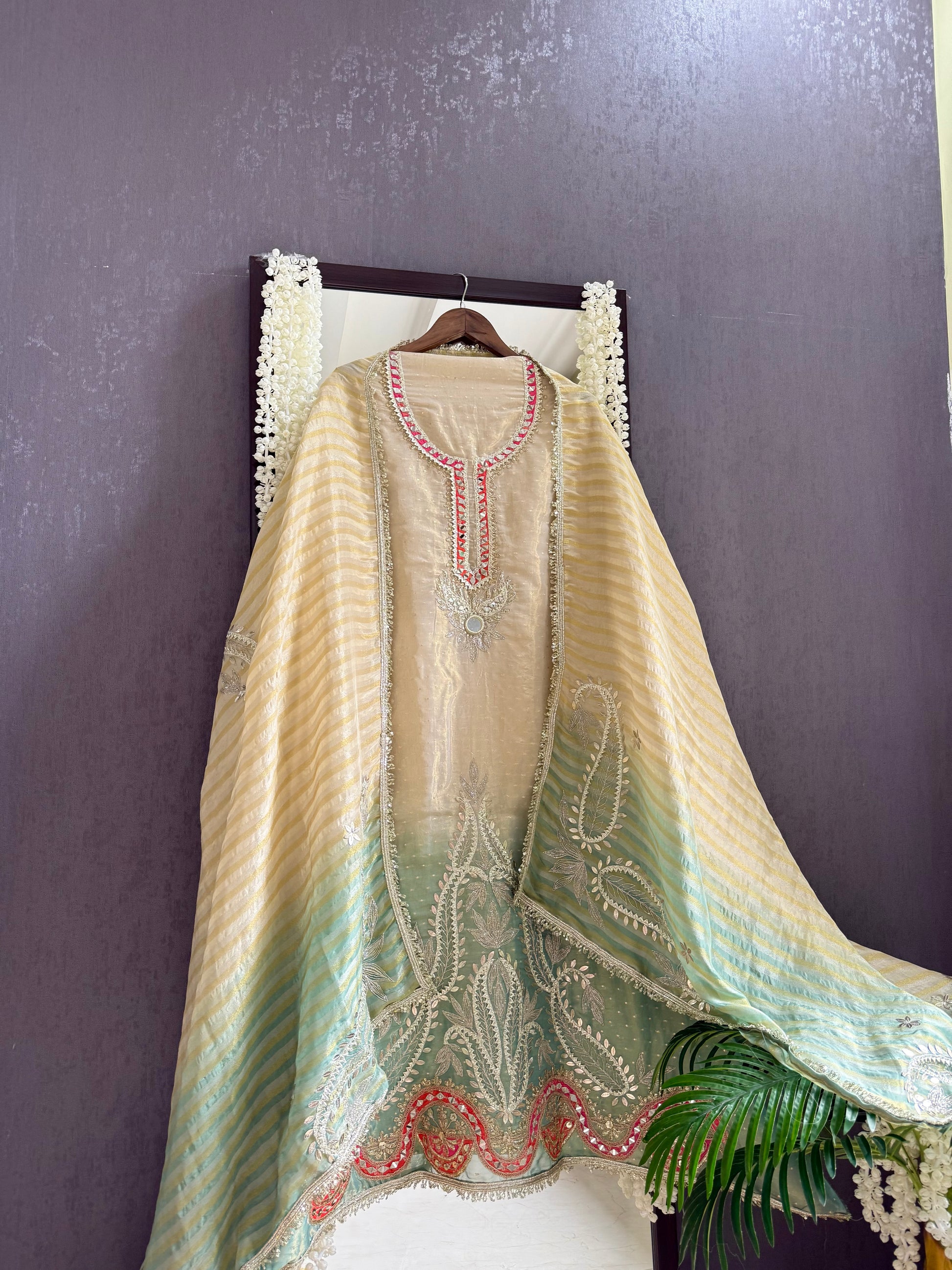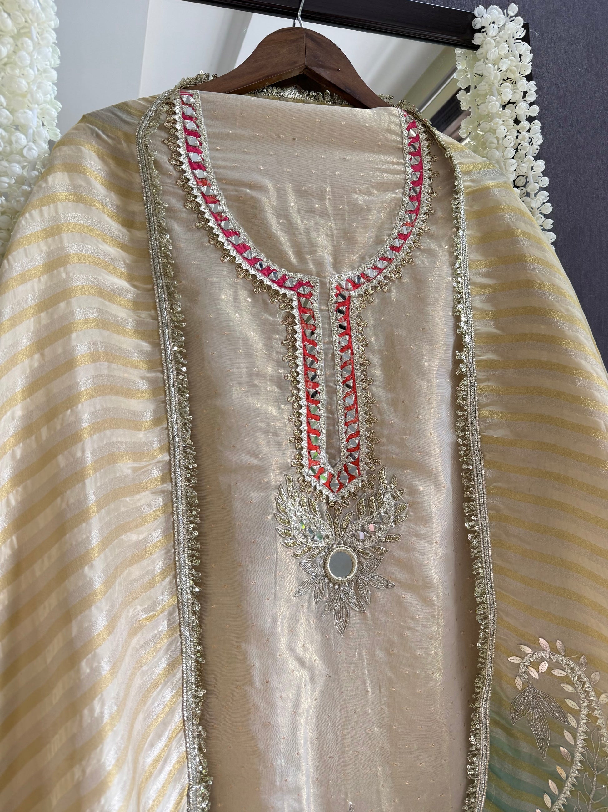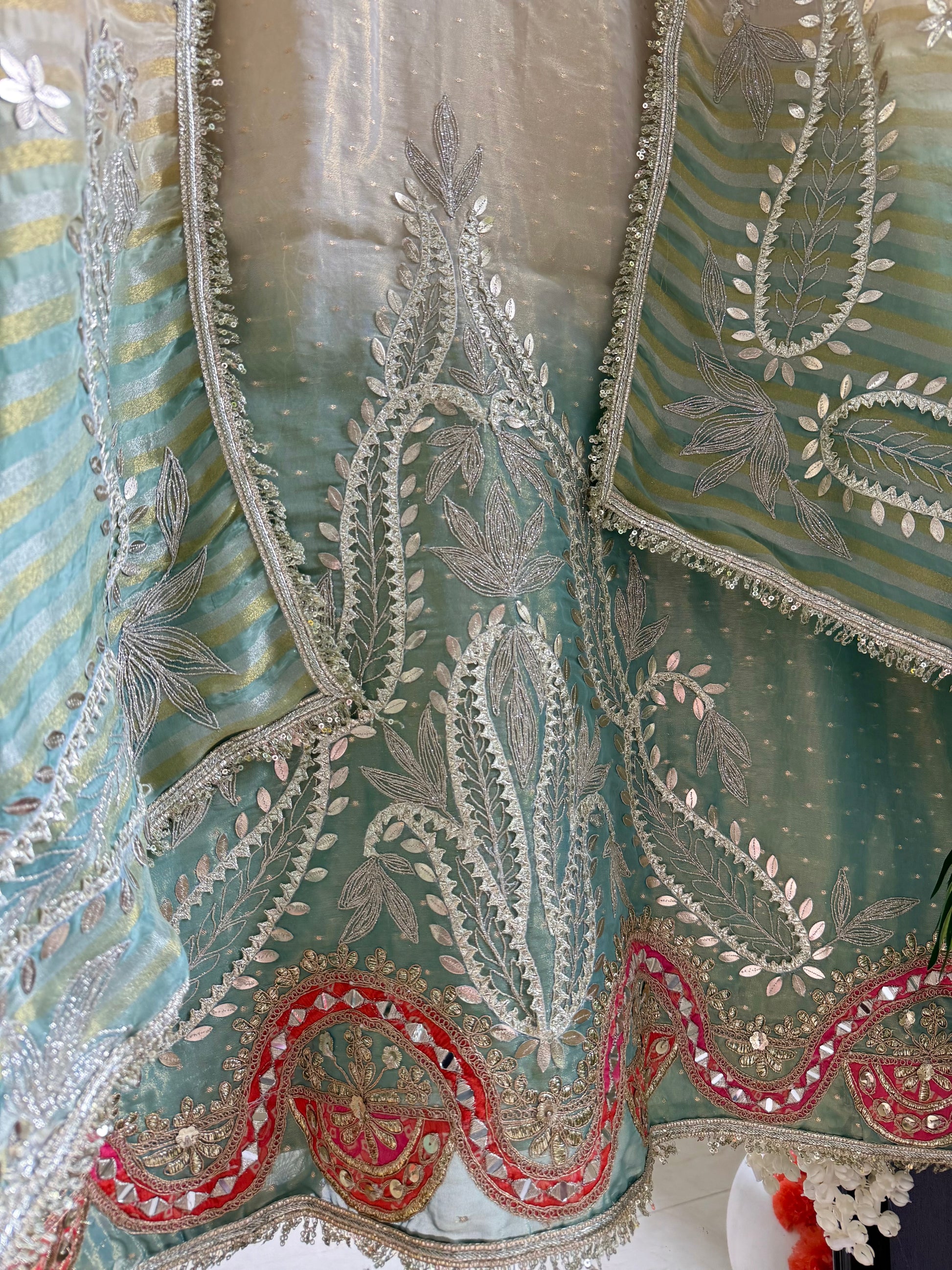 Dupatta- Pure benarsi tissue silk dupattas with heavy gotapatti borders and aari work with unique combinations of patterns in thr middle part of dupattas.