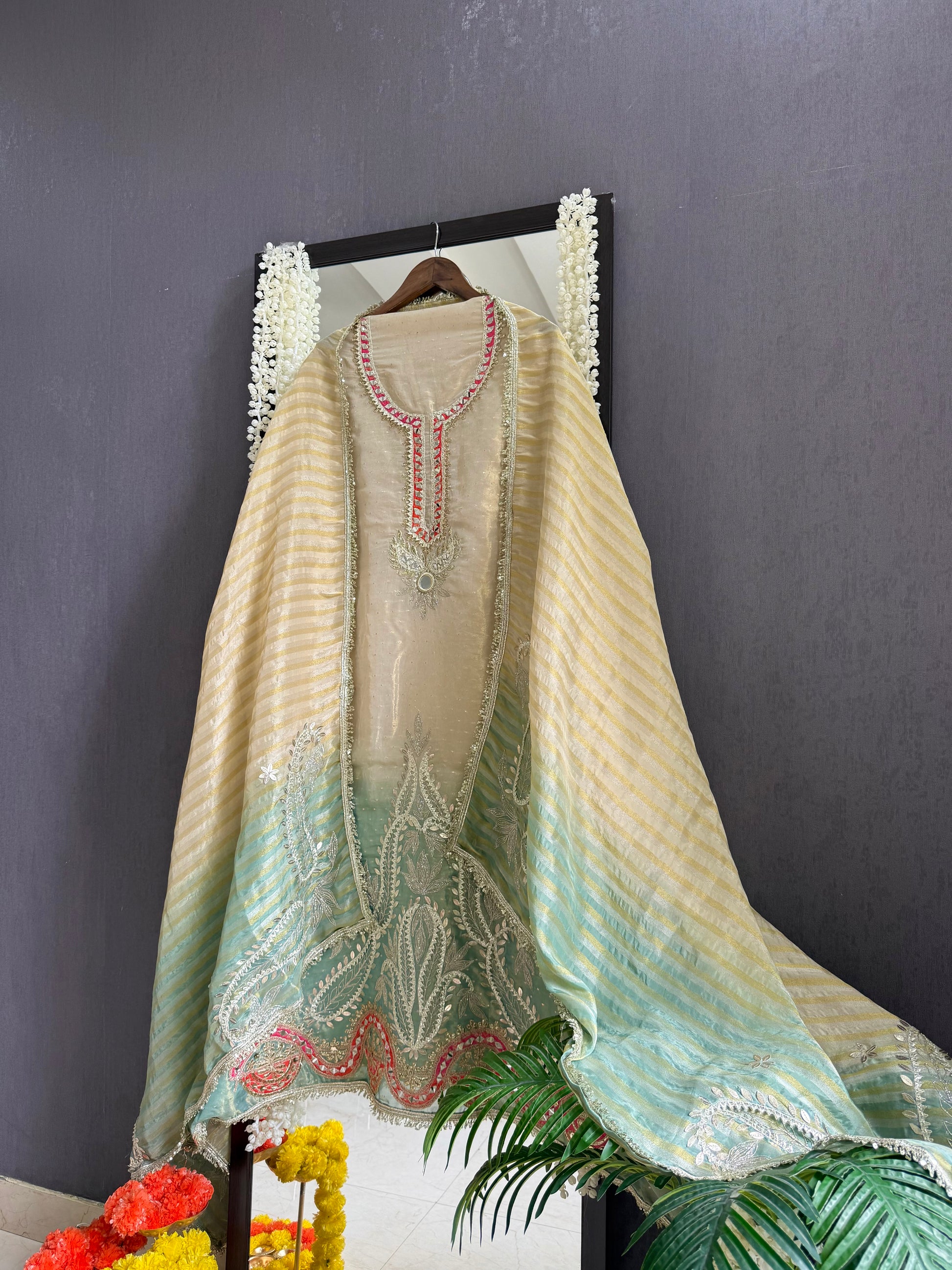 Shirt-Pure Tissue silk Benarsi woven kurtas with heavy gheras and neckline - heavy gotapatti and with aari work paisleys embroidered patterns.Ombré shade kurtas.