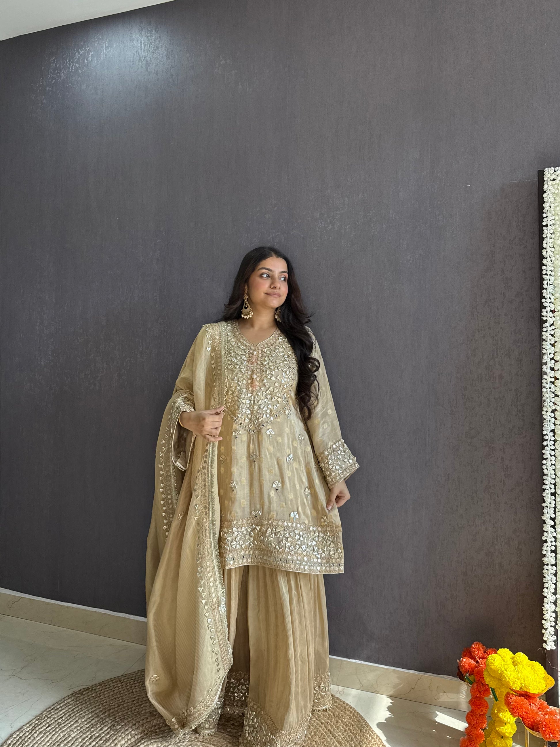 • Paired with  flared sharara embellished heavily by gotapatti work.