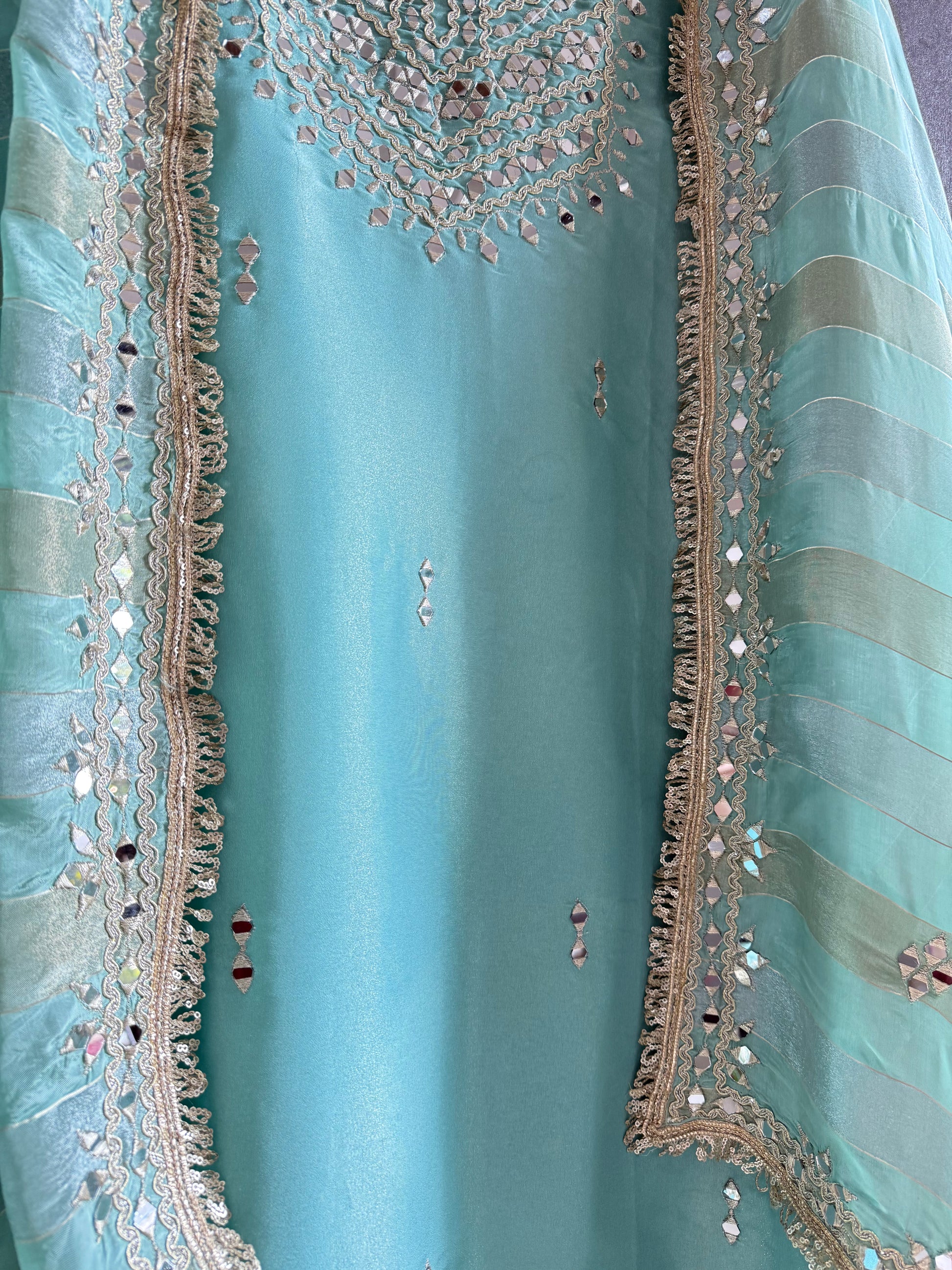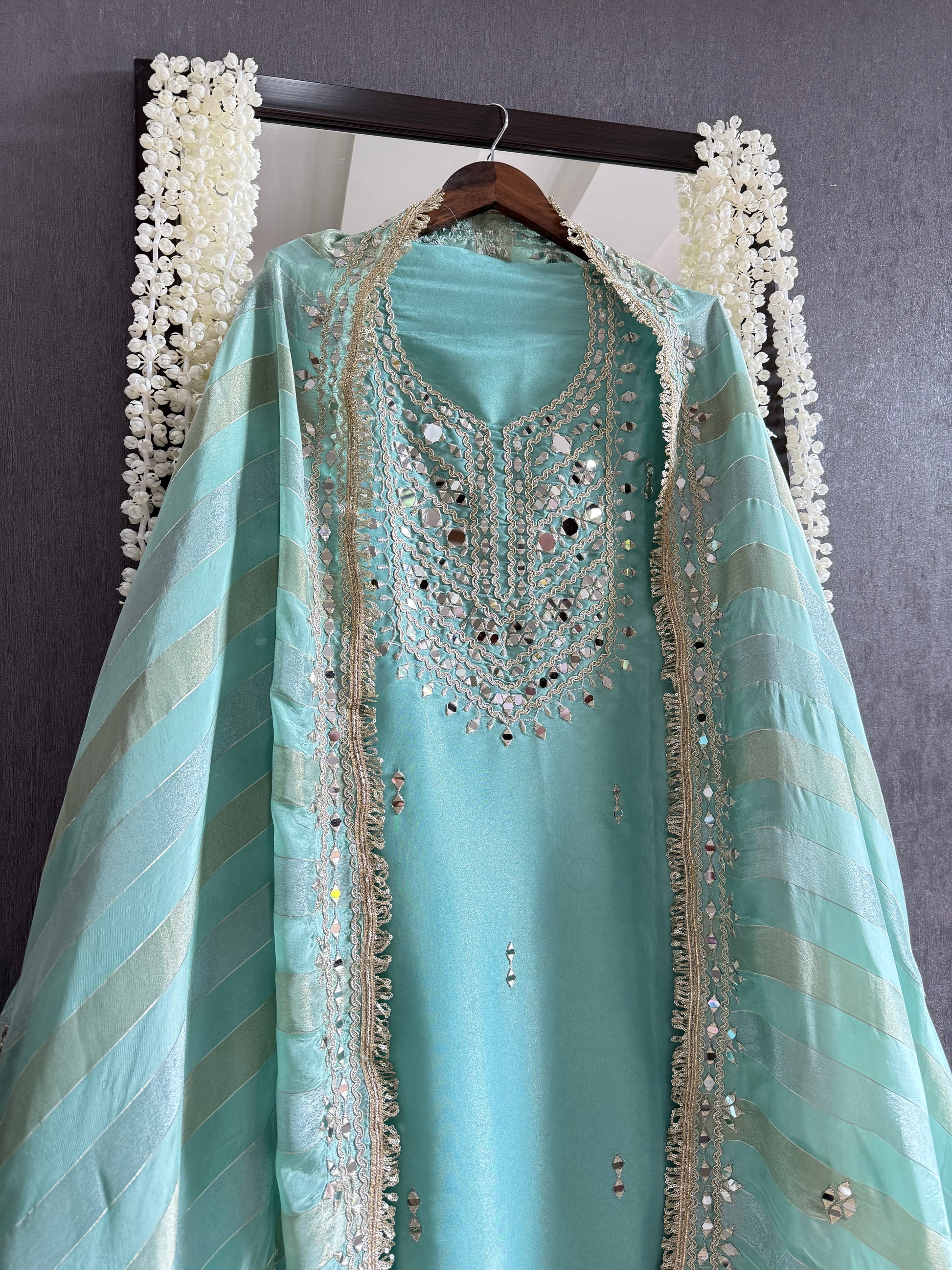 Three -piece luxurious tissue silk mirrorwork handwork suit.