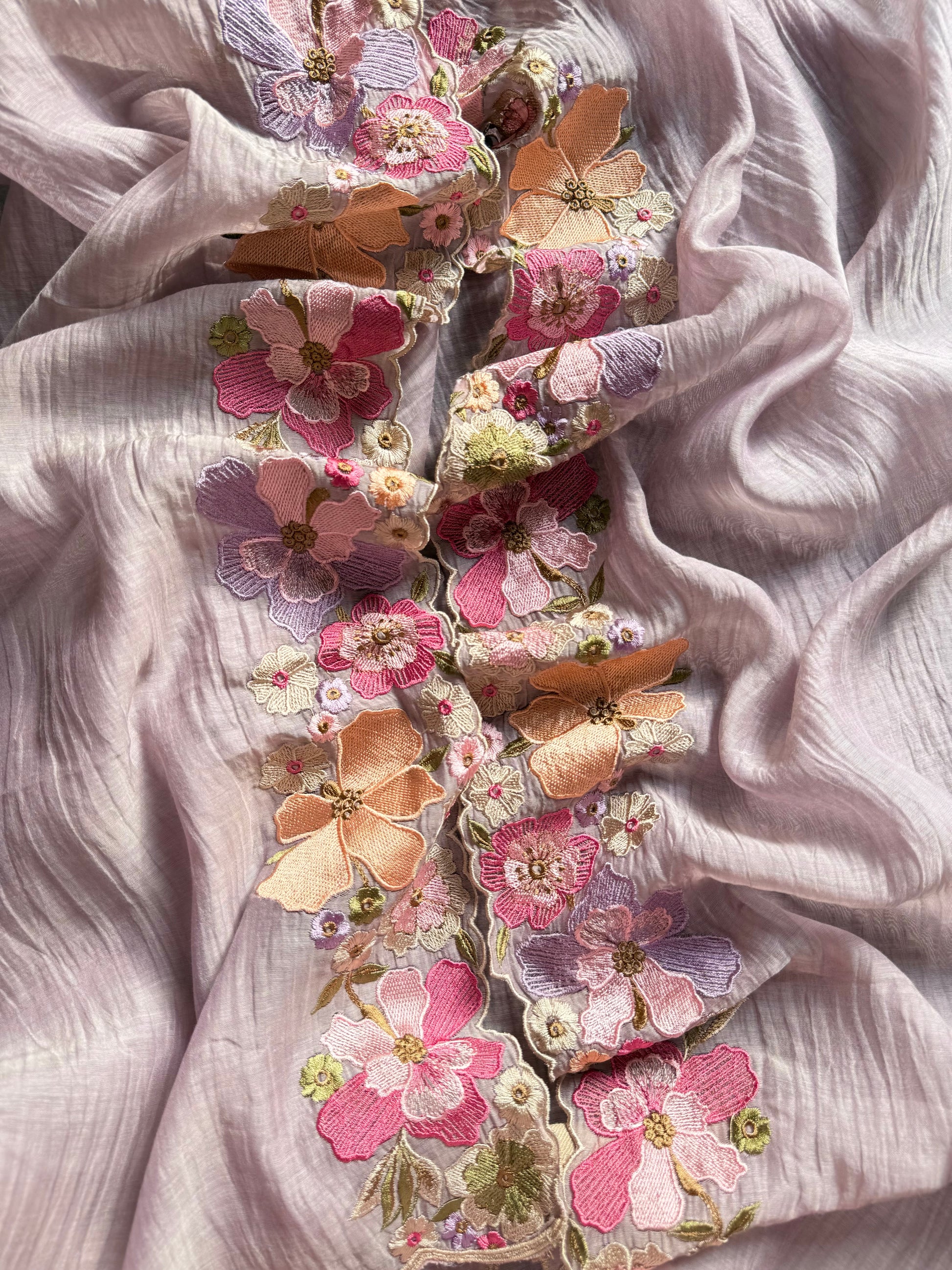 Luxurious Mul chanderi appliqué work floral suit
