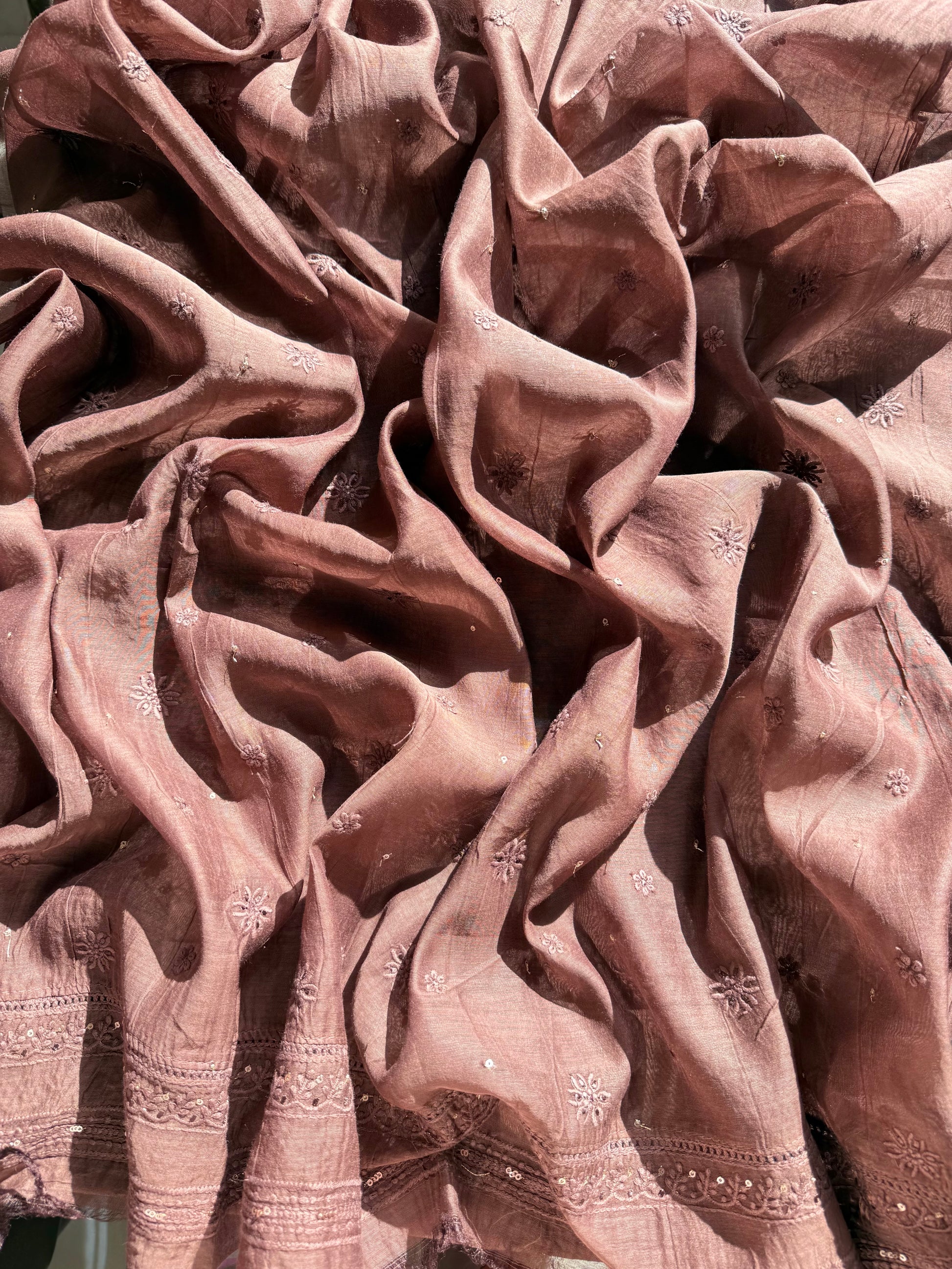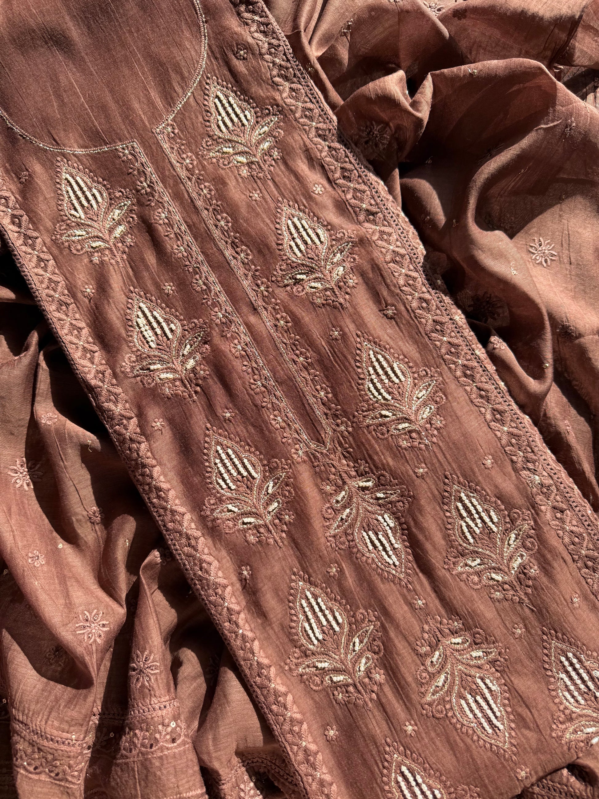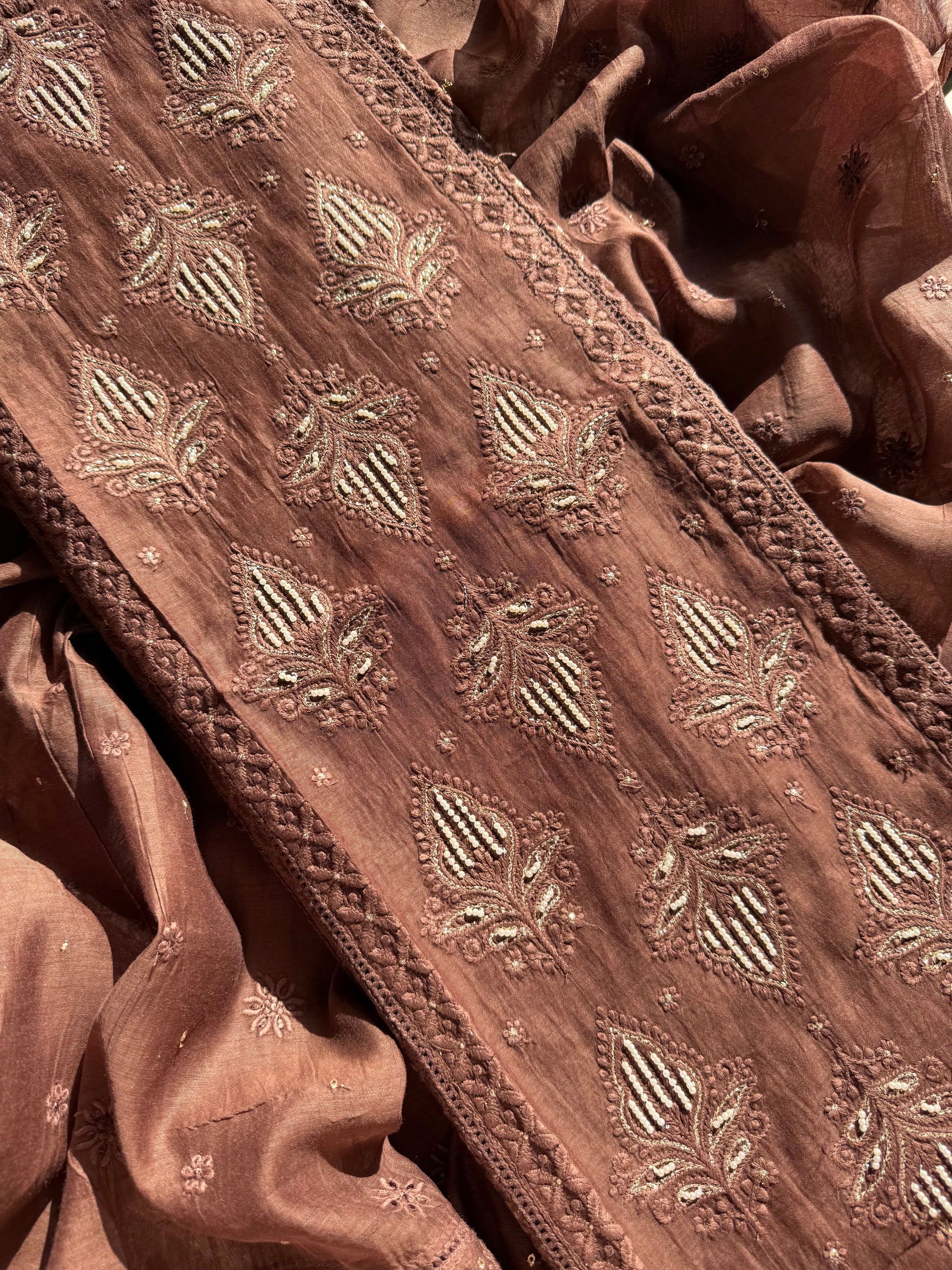 Three -piece pure Mul Chanderi cotton lucknowi hand embroidered unstitched suit.