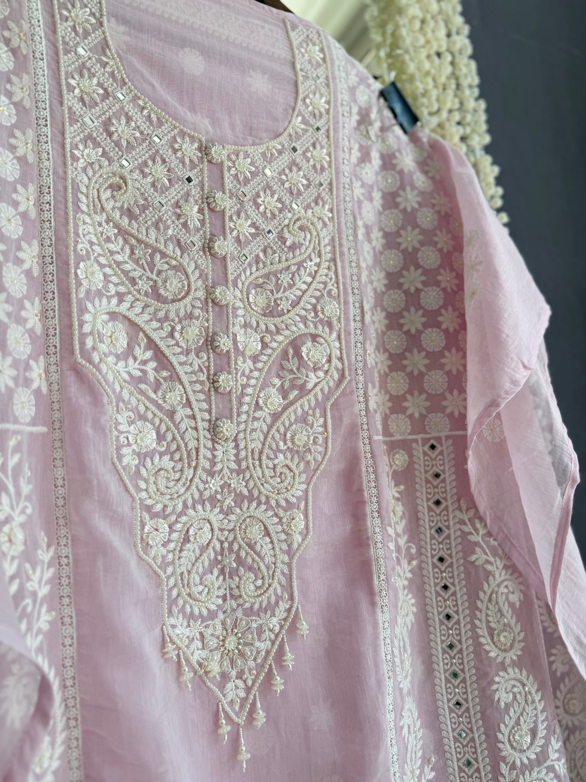 Shirt-Elegant, Easy-To-Style, & Statement-Worthy, pure Chanderi Mul cotton hand embroidered kurta with Lucknowi work, soft pearls, metal tassels and paani sippis. The entire kurtas have heavy A line silhouette pattern.