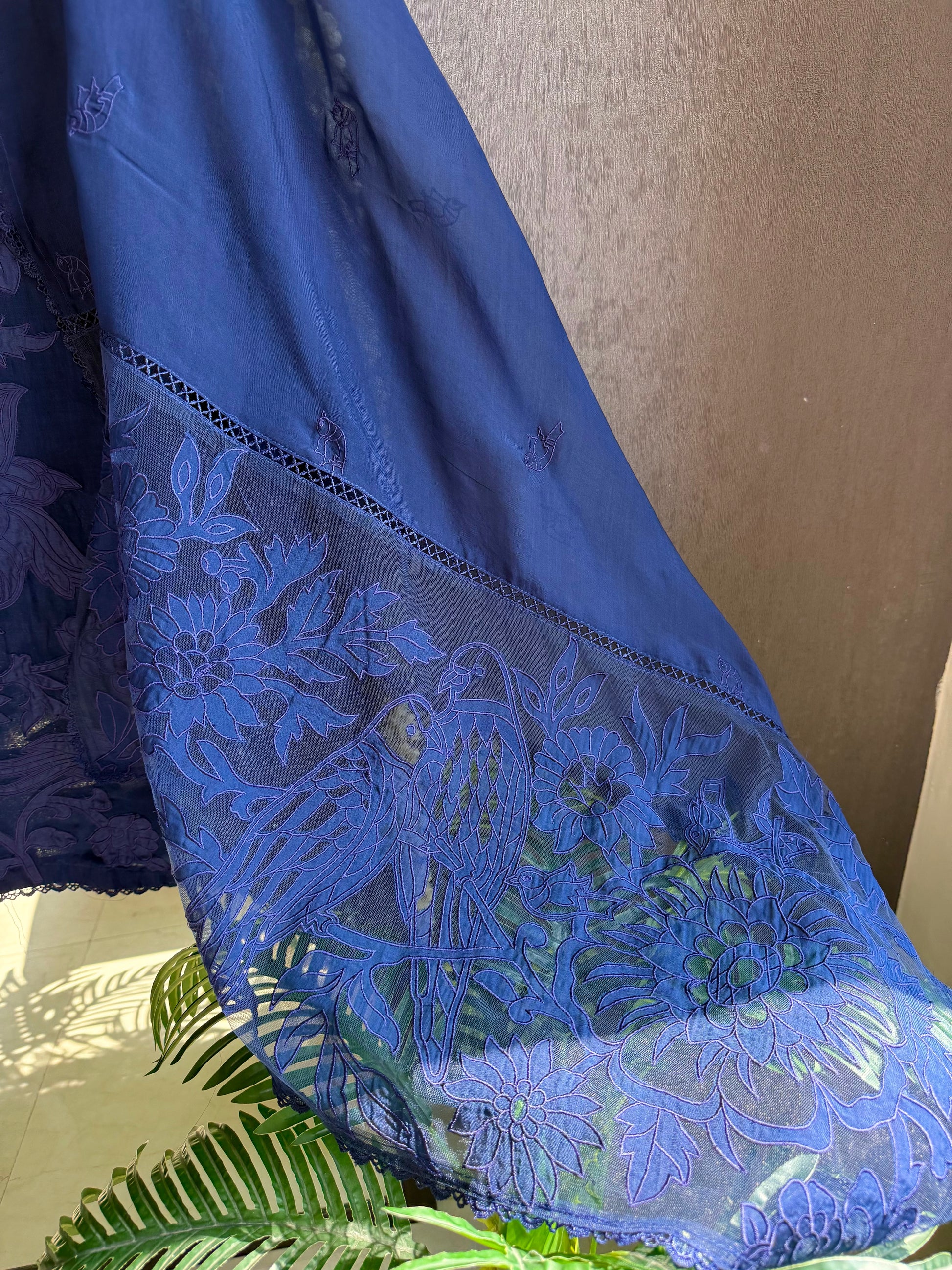 Three -piece pure organza appliqué hand embroidered unstitched suit.
