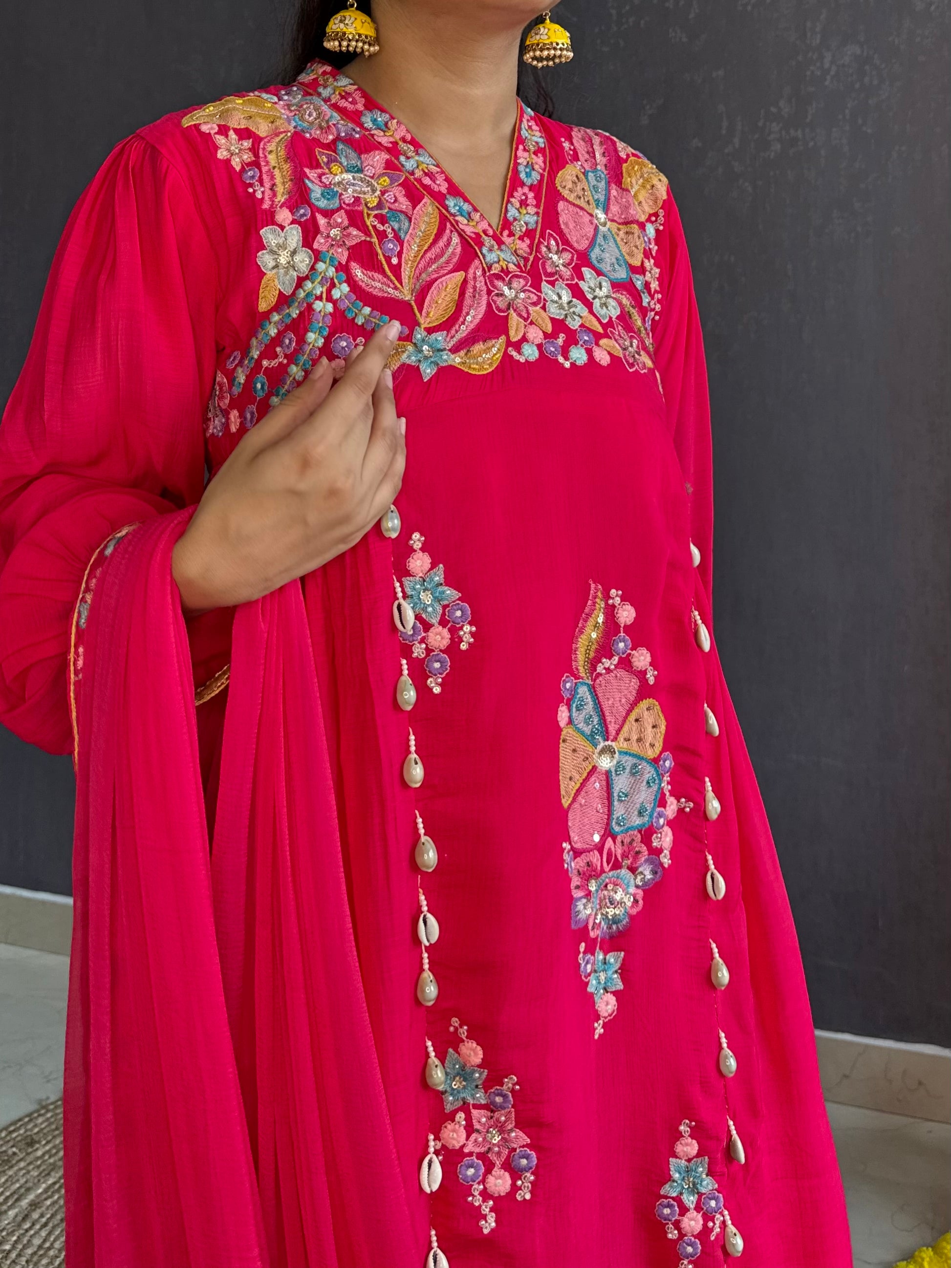 • Kurtas, pants hemline and dupattas are enhanced with thread embroidery and floral buttidar embroidery which is highlighted with dreamy handwork.