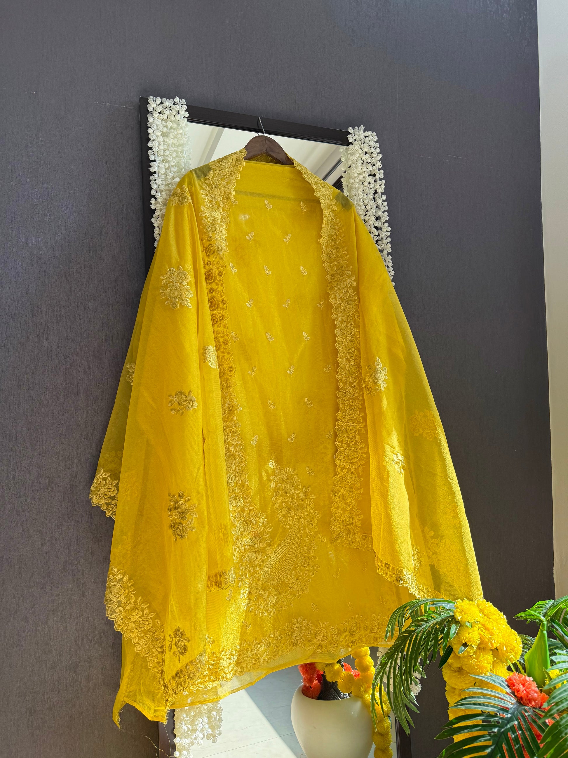Dupatta- Tissue organza silk Dupattas are beautifully embellished in finished borders with parsi work and roses patterns in buttas allover.