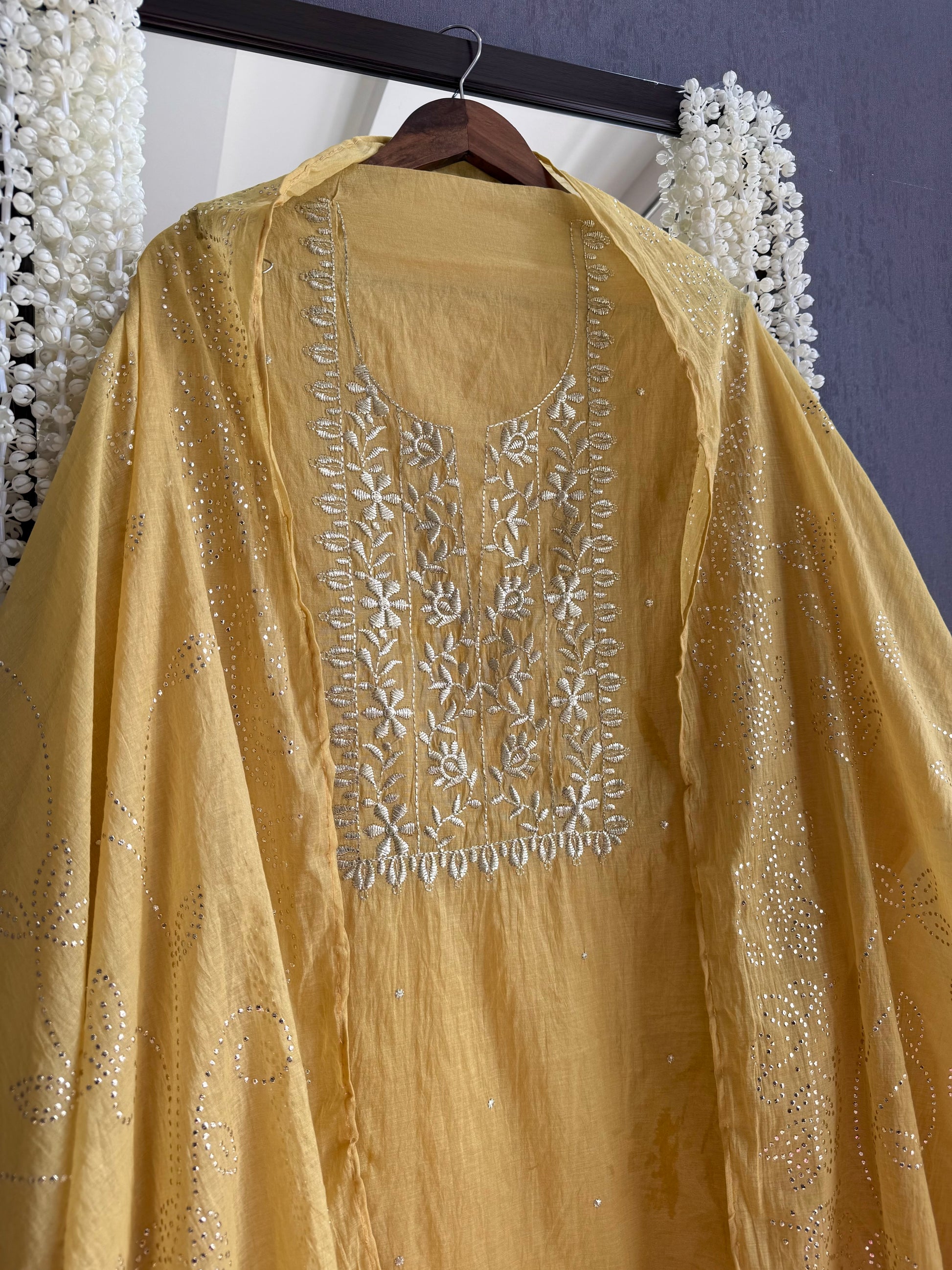 Three -piece pure Mul Chanderi cotton mukaish embroidered unstitched suit.