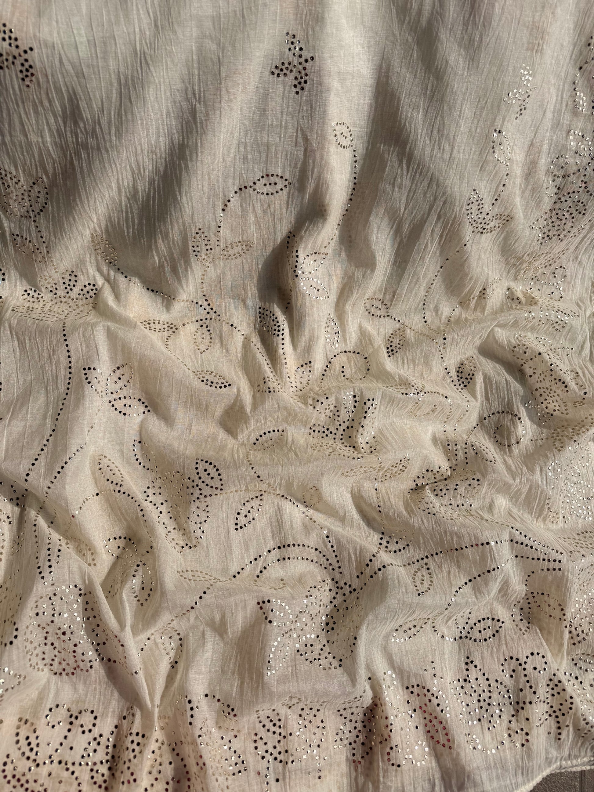Three -piece pure Mul Chanderi cotton mukaish embroidered unstitched suit.