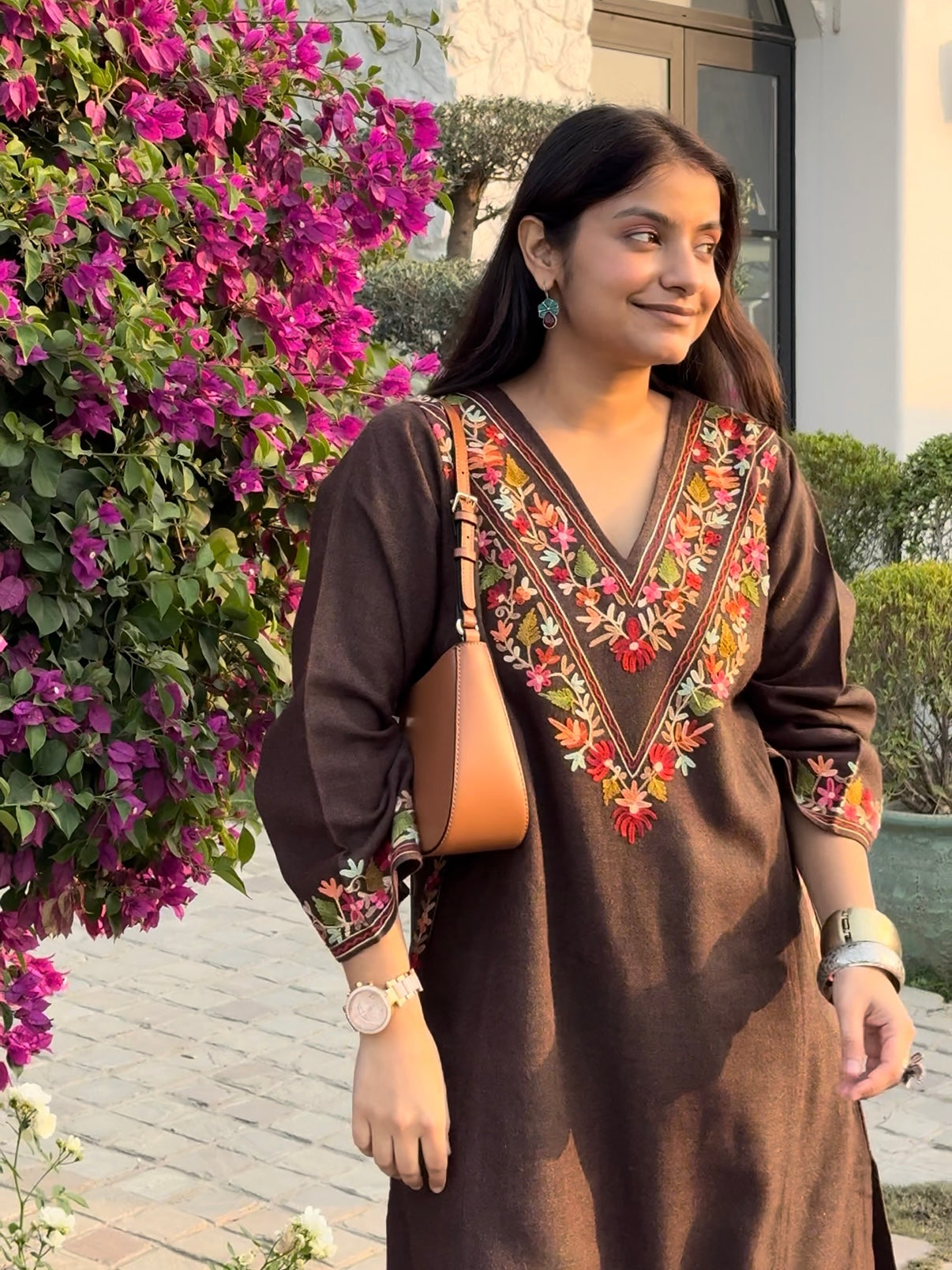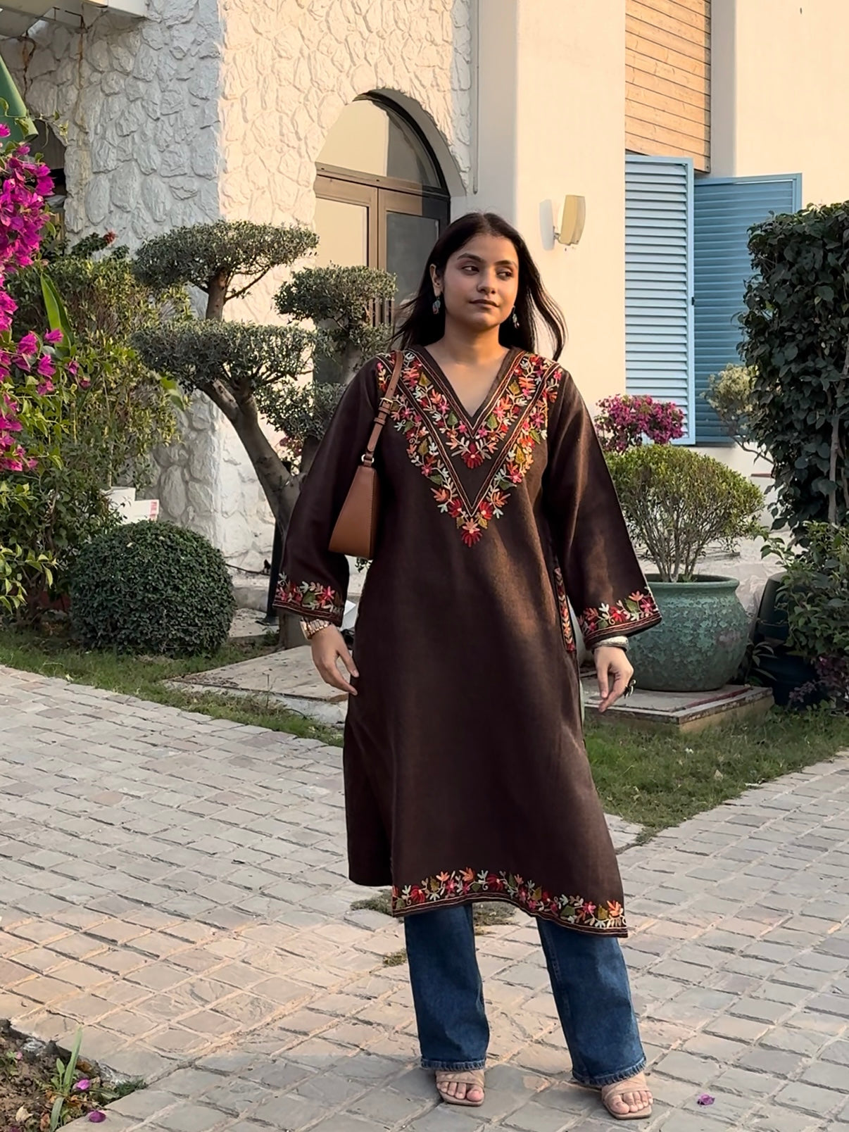 • Soft premium Pashmina fabric with kashmiri aari work on phiran kurta . Work goes front and back, on arms and on ghera