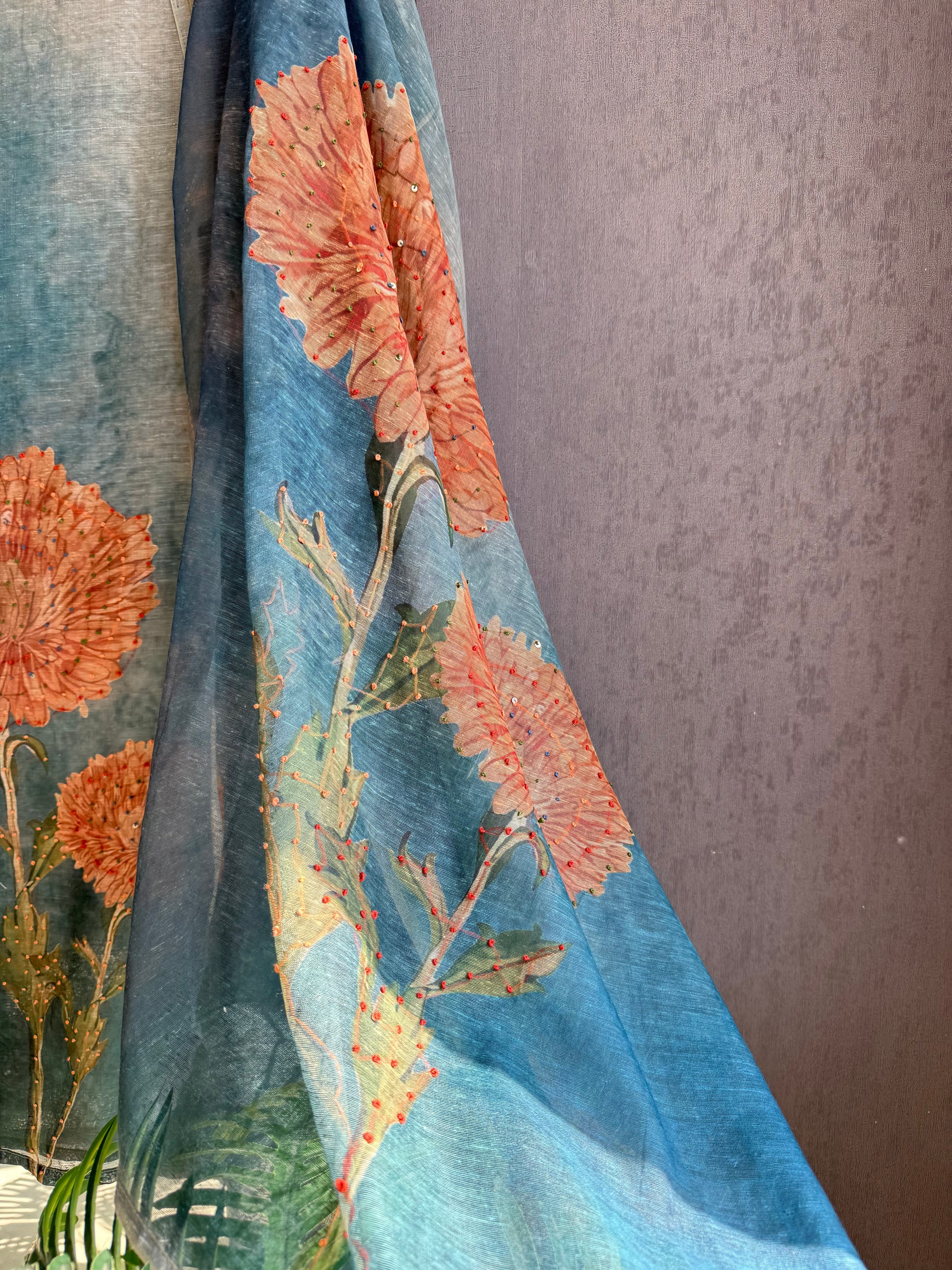 Dupatta- Pure linen marigolds suits embellished with kantha work.