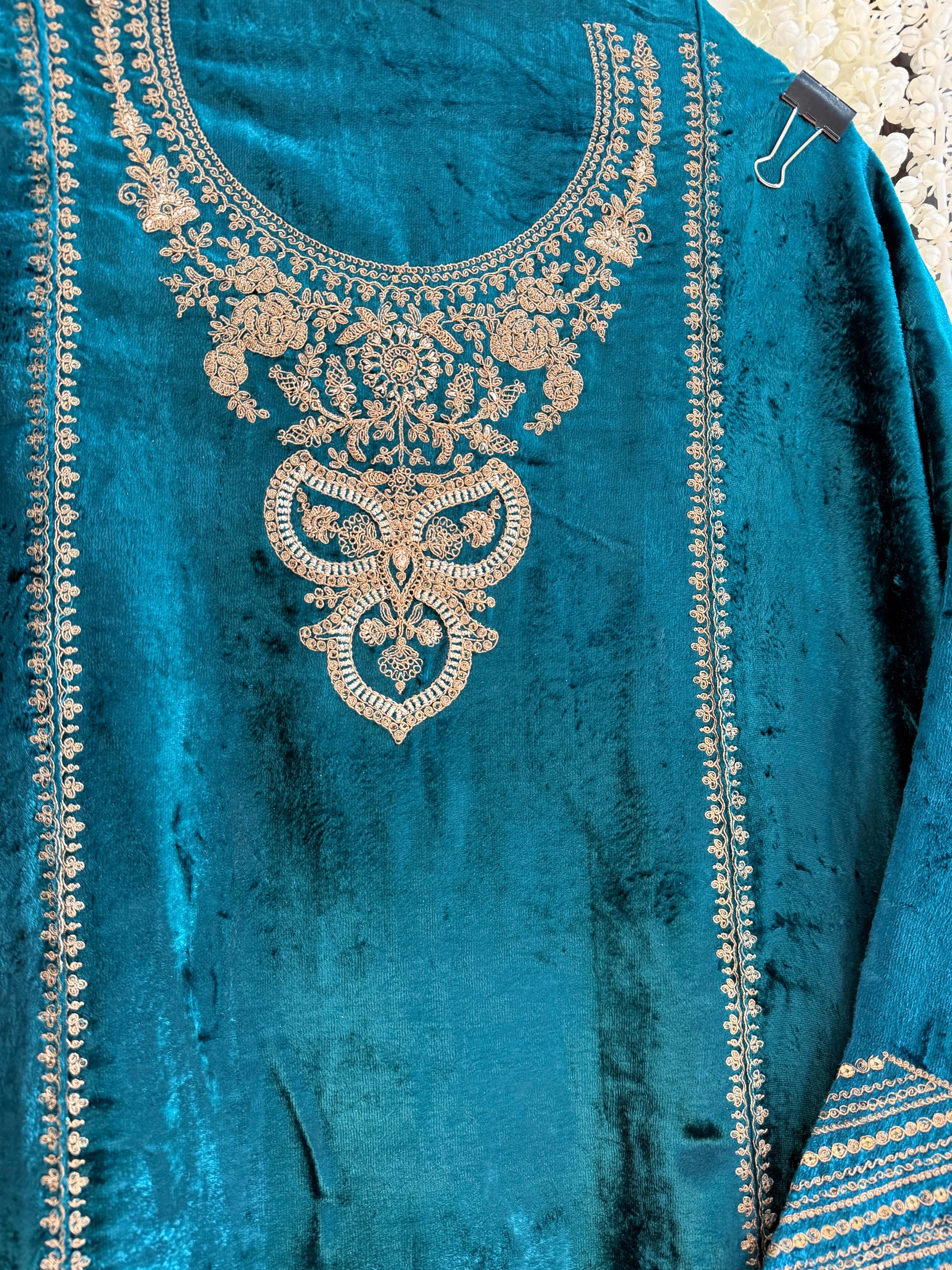 Shirt-Pure Velvet shirt with beautiful Marori Aari and its in kalidaar Anarkali semi stitched pattern with heavy ghera.